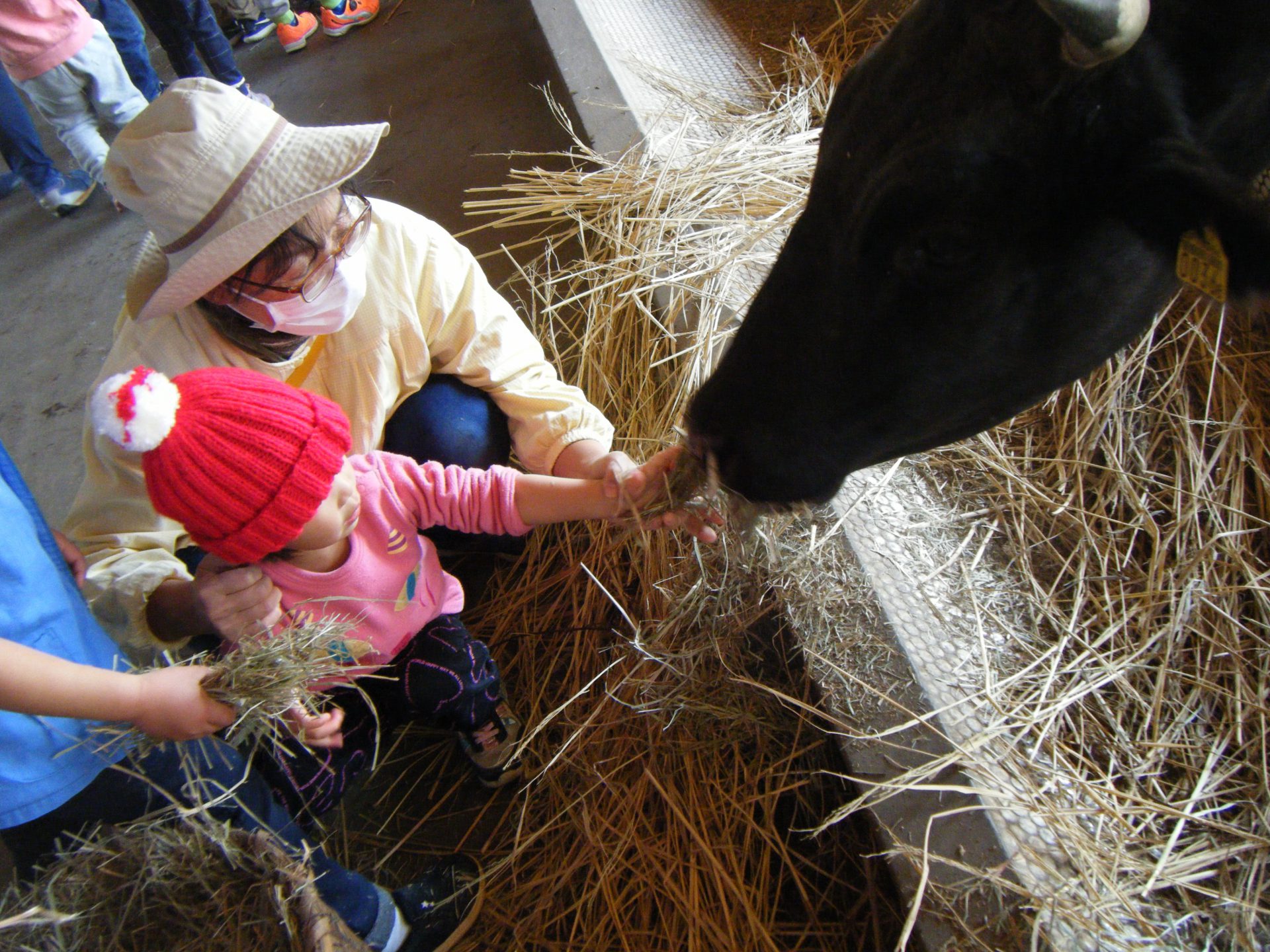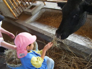 ・餌をあげる時に手をなめられた子が何人もいて思わす言葉にならないような声を出す子や「あたたか~い」と感想をいう子がいた。大きくて長い舌をべろっと出す牛に始めはしり込みしていたが、わらより干し草の方が喜んで食べるという事や、草のさし出し方をおしえてもらい餌やりに興味を持てた。