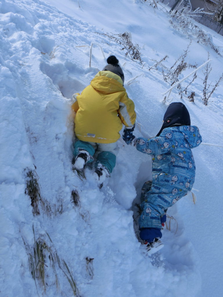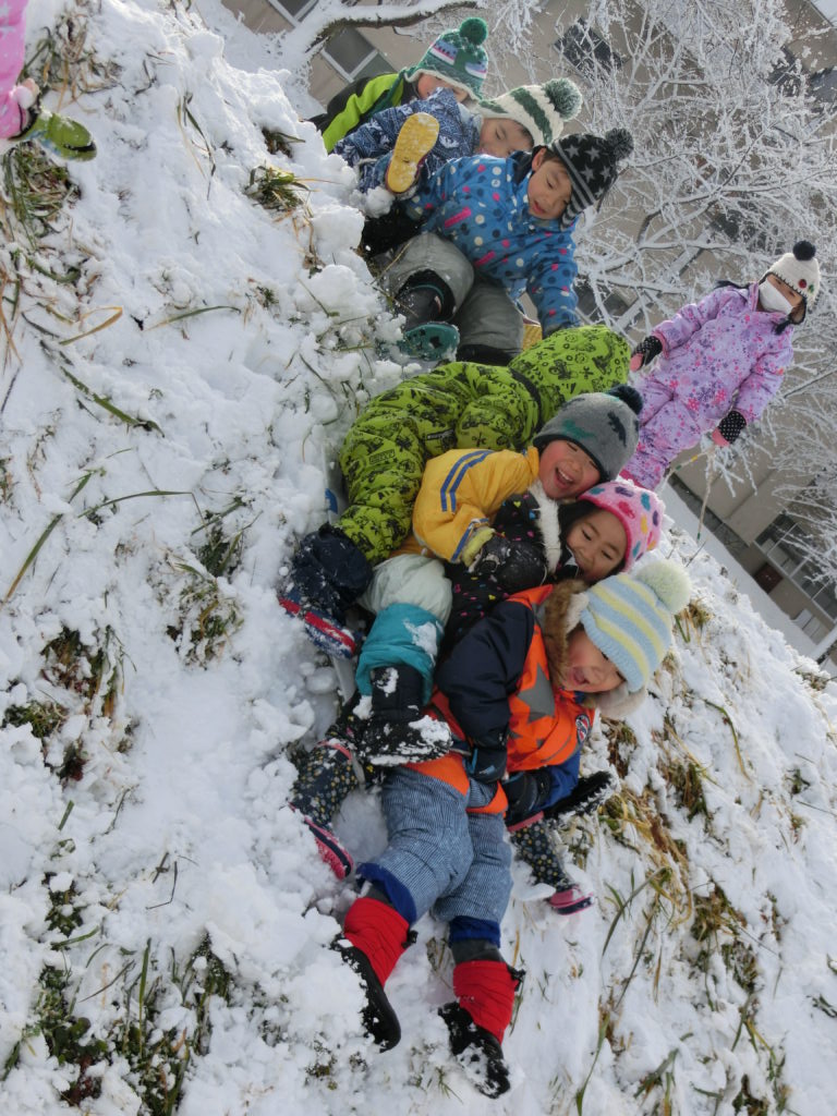 雪が少ない今年の冬。でもみかんぐみは少し雪が降ると「先生!今日は外へいこうね!」と天気を見てその日の活動を決めています。いざ、外へ!田んぼの土手で肥料袋のそりを使ってすべるのはもうお手のもの!