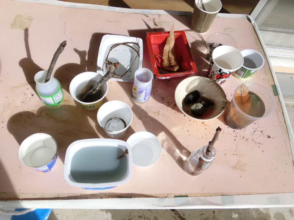 また、葉っぱや木の実、枝を入れるとどうなるのか実験しているお友達もいました。「石を入れると凍りにくいんだよね。」とつぶやいていました。「どうしてだろうね?」答えは出ていませんが、考えて氷作りをしていました。