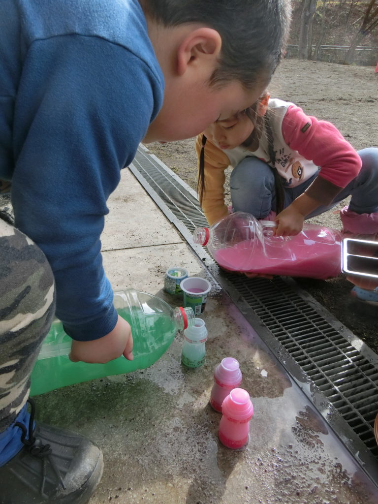 身近な自然の美しさや不思議さに触れて子ども達は興味関心をふくらませていきます。今回の氷というテーマの遊びでは夏に遊んだ色水や秋に遊んだ木の実や枝どんぐりといった今までの経験を今の遊びに活かしている姿がありました。また、暖かい、寒いなどの感覚から凍らせる場所を考えるなど、どうやったら氷になるのか試行錯誤する場面がたくさん見られました。なかでも実験し分かったこと、発見したことを友達と共有できるようになったことに成長を感じました。「見て!こうするといいいよ!」と発信することはもちろん「そうか、そうだね!」と受け入れる気持ちが育ってきたのだと思います。