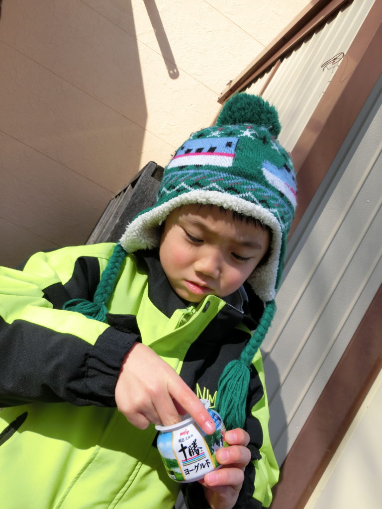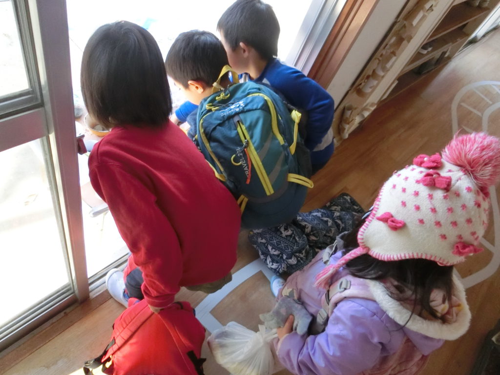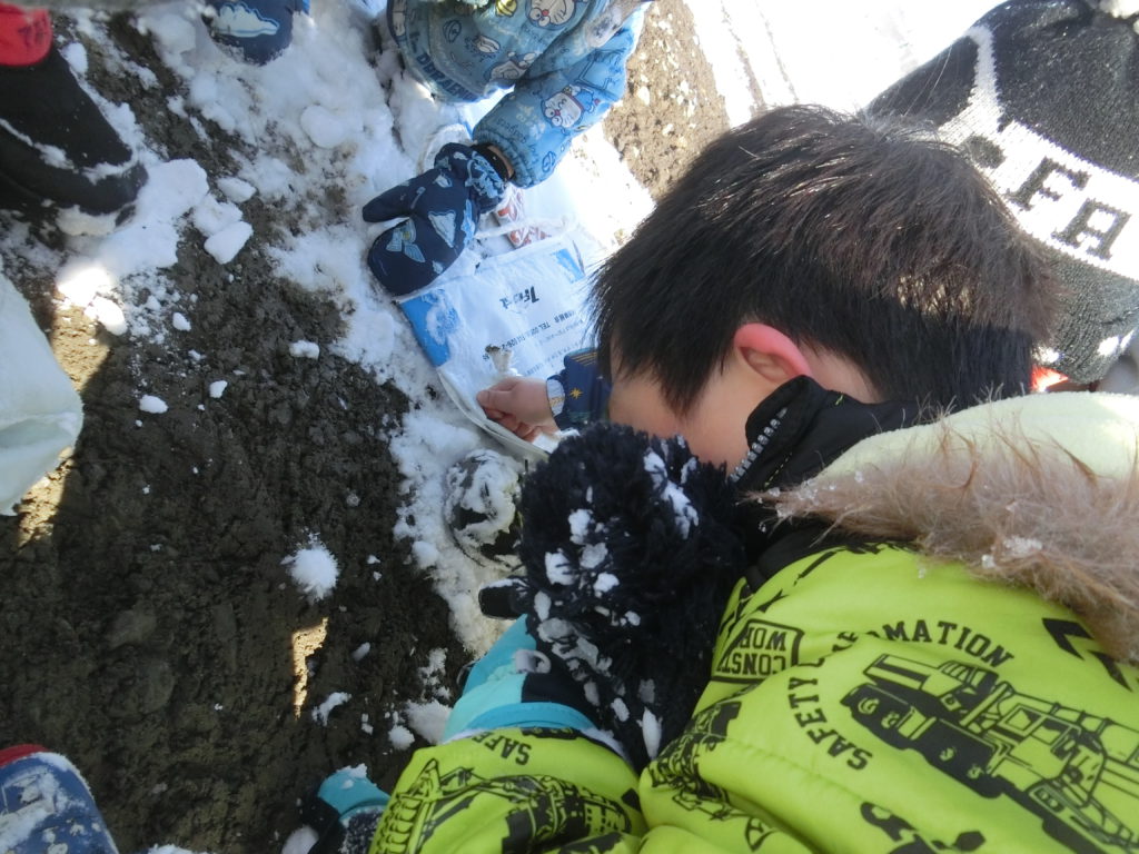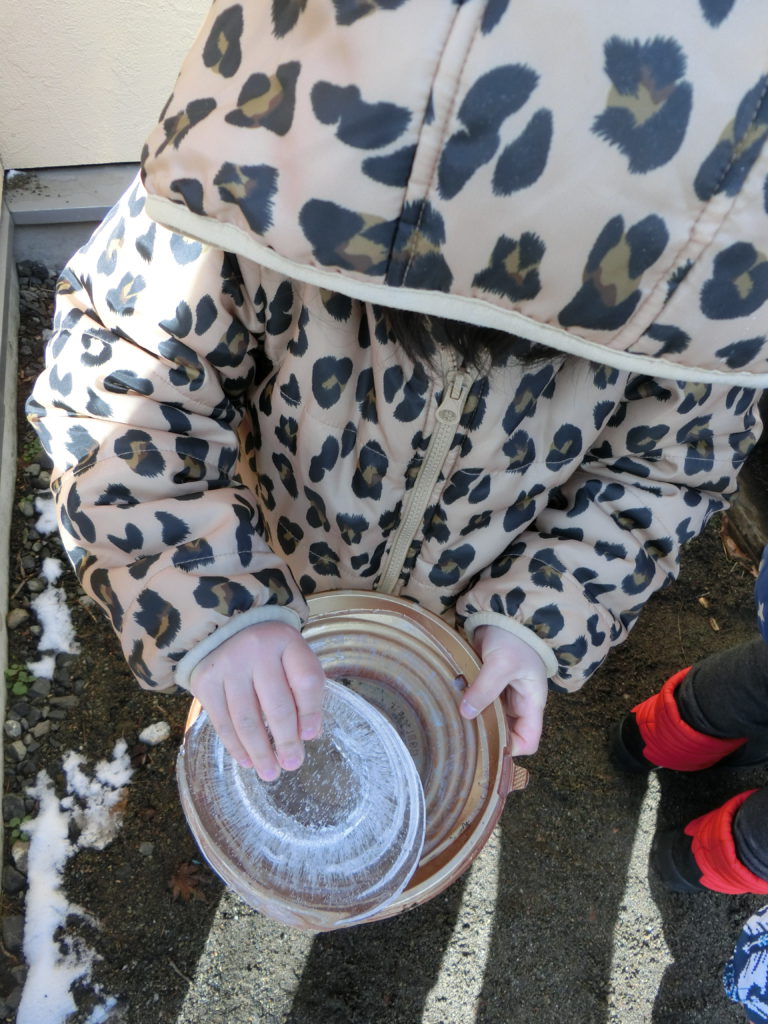 今年は暖かいからというのもありますが、なんでなかなか凍らないんだろう?と思った子ども達。「寒いと凍るんだよ」「冷蔵庫に入れたら?」という意見が出ましたが、冷蔵庫は食べ物しか入れられないんだよ、ごめんね、と伝えると「そっかー、」「寒いところ…」と考えていましたが、「もうひとつ冷蔵庫があった!」とひらめいたようです。