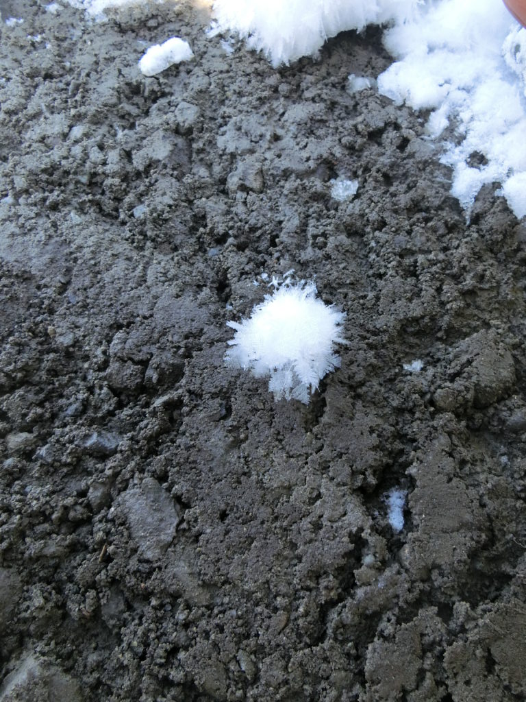 駐車場では大きな雪の結晶を発見!「わー、すごい、きれい…」しばらく無言で見つめます。