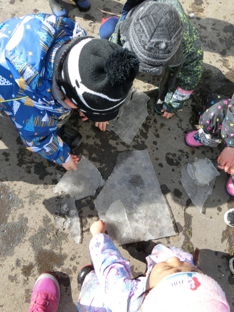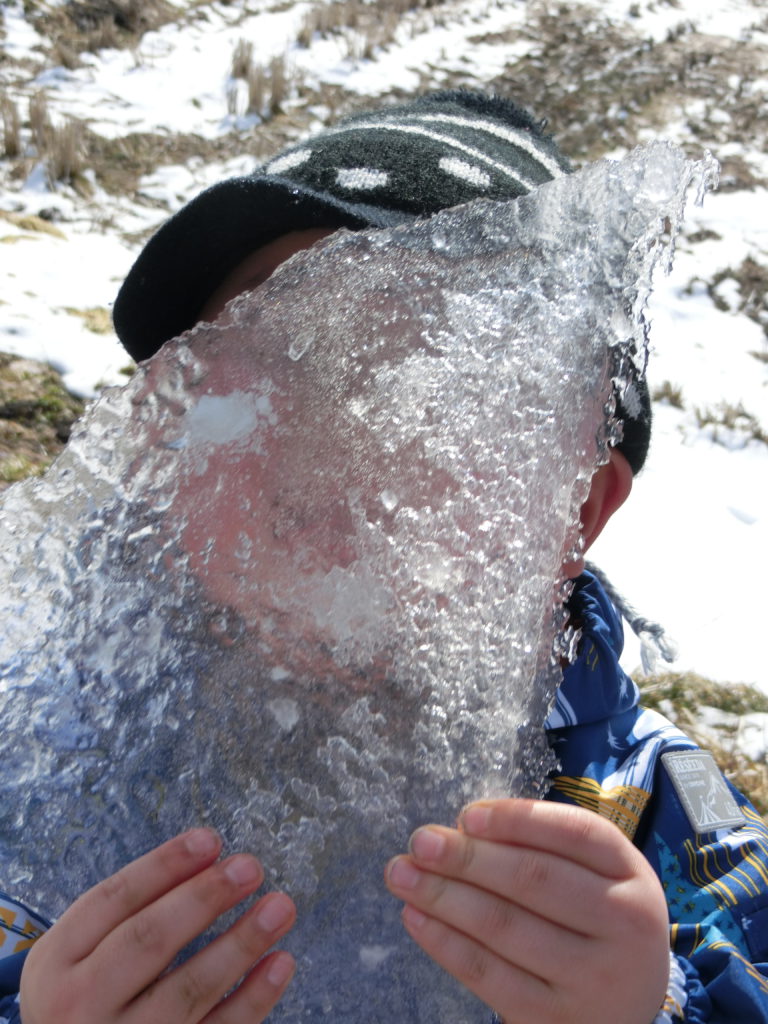 また、用水路の氷は乗っても割れないくらいの厚いところと、手で持つと壊れてしまうくらい薄いところがあることも体験の中で感じていました。
