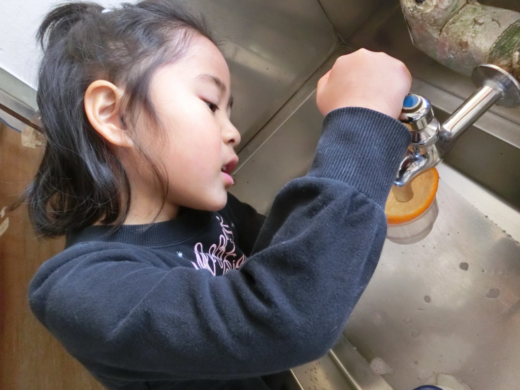 「できてるー!」「でも半分しか凍ってないよ」「やっぱり冷蔵庫かな…」(外の冷蔵庫のことです。)場所を移すとどうなるのか、実験は続きます。