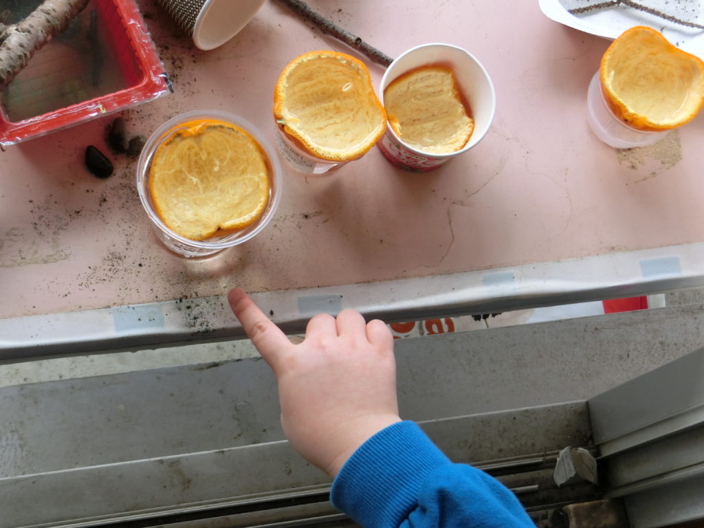 ☆給食ででたぽんかんの皮がつるりと上手くむけると、みかん氷作りを思いつきました。ところがお尻が丸くて転がってしまう、どうしよう…「そっと置けばいいんじゃない?」「だめだ、コロンてなっちゃうよ、」すると「いいこと思いついた!」