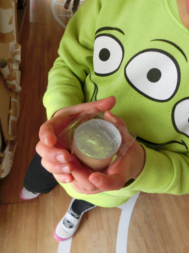 「カップに入れればいいんだよ!」「本当だ!」大成功です!この方法を思いつくとチーズの容器で氷を作りたくなったときも応用し、「これなら大丈夫!」と得意気に水を入れていました。