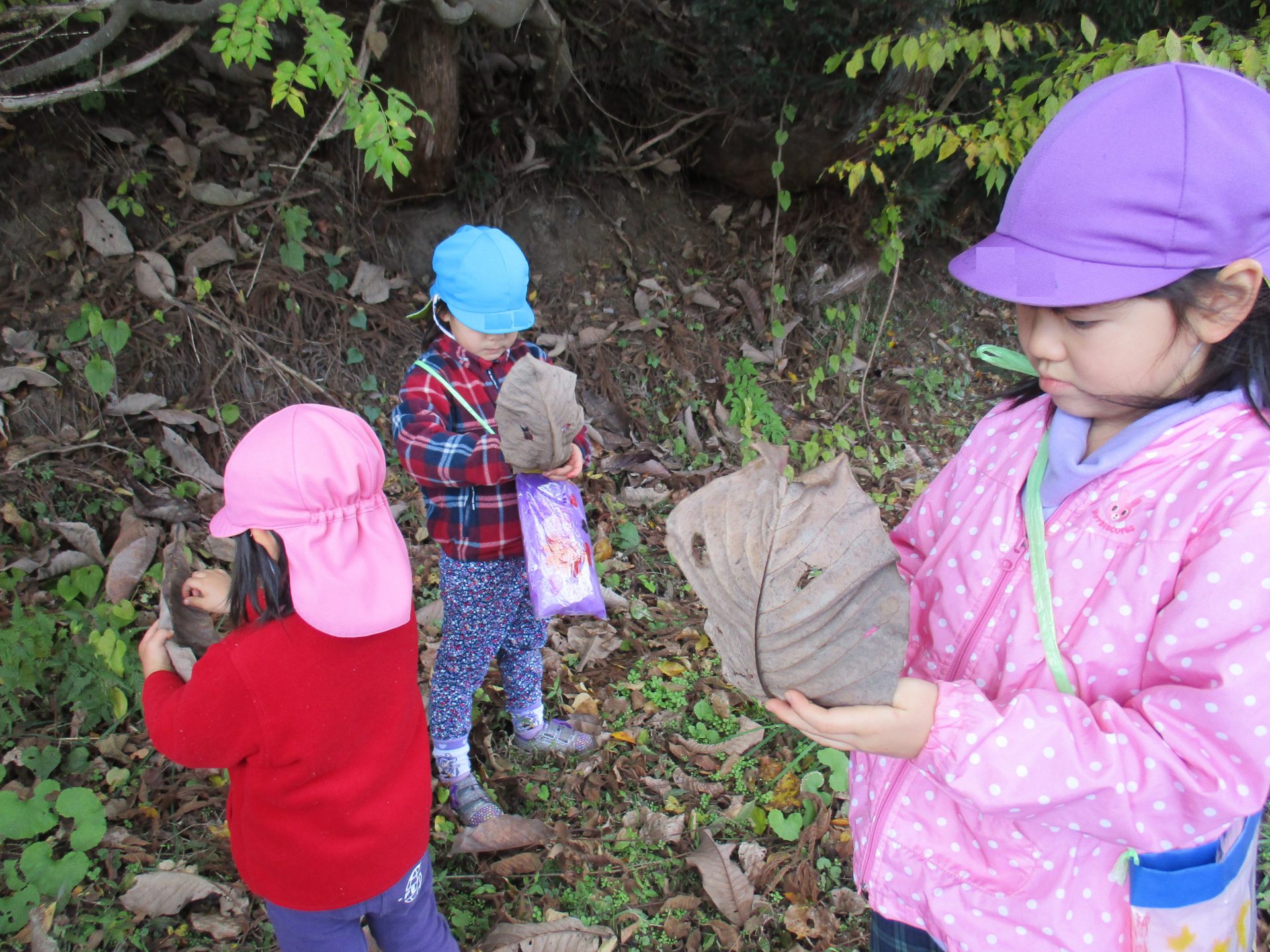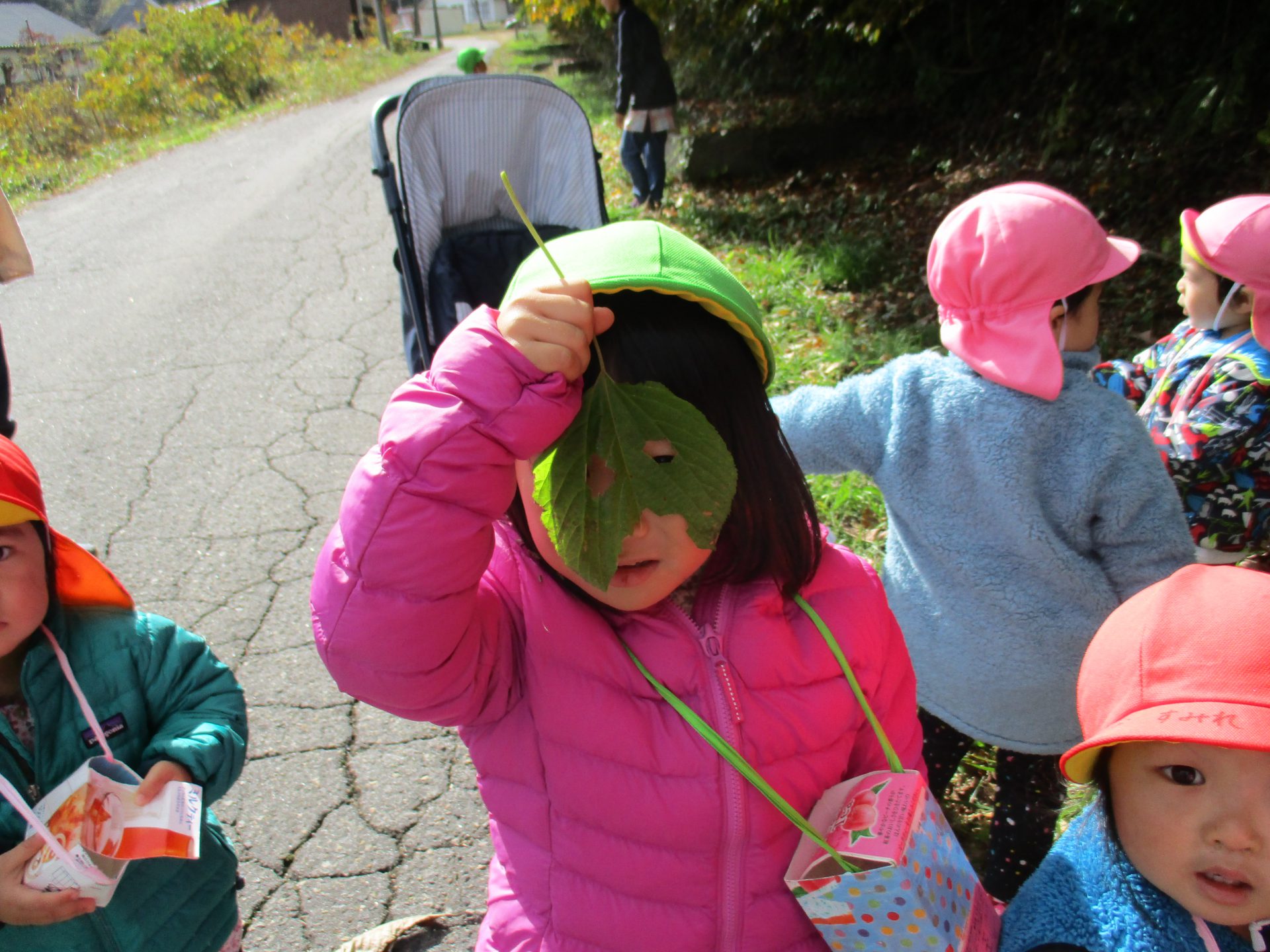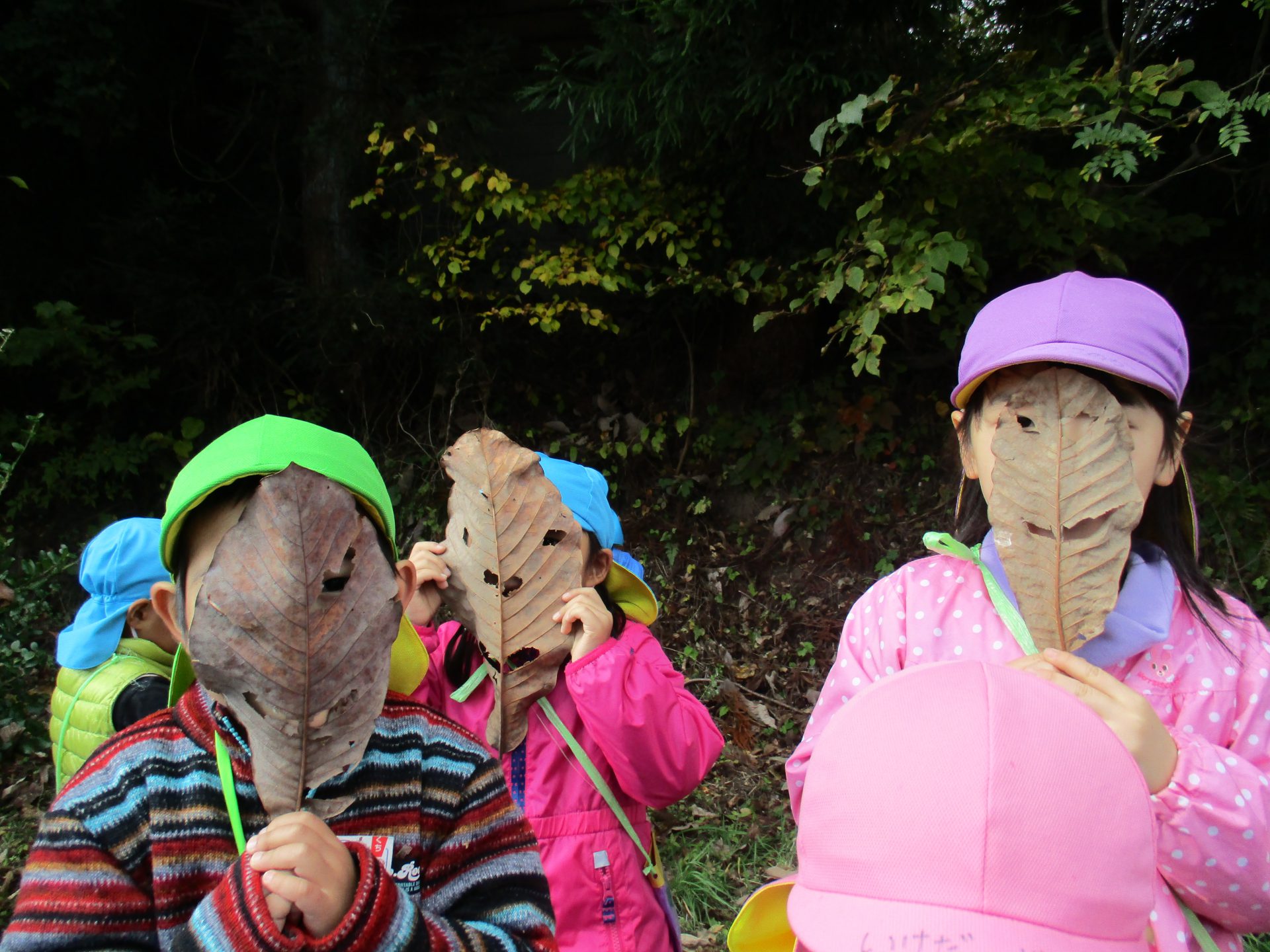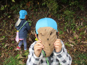 大きな葉っぱの落ちている場所で、みんなでお面を作って遊びました。