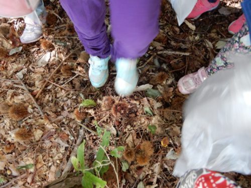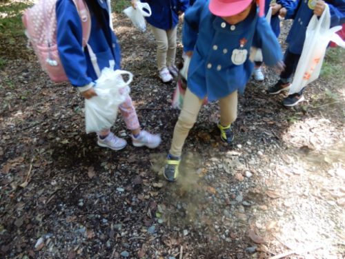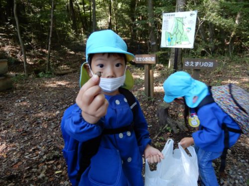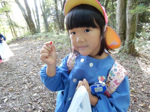 秋は、春には落ちていなかった、どんぐり・栗・まつぼっくり等の自然物を収集し、おみやげにしたり、落ち葉を踏んだ時のカサカサとした音を聞いたり、周りが茶色になり、きのこが生えていたりと、春とは違う体験ができた。