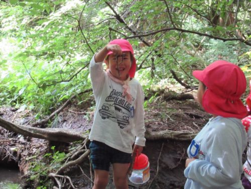 年少:薄暗い森の中を、初めは怖がる子もいましたが、草花や生き物を見つけたり、鳥の鳴き声を聞いたり、木の実を集めたりするうちに、どんどん森の魅力に引き込まれていったようでした。小さい頃から森や川など自然に親しみ、自然の中で心と体が育っていくことを願っています。