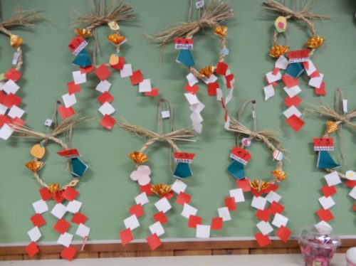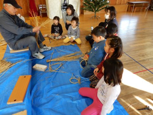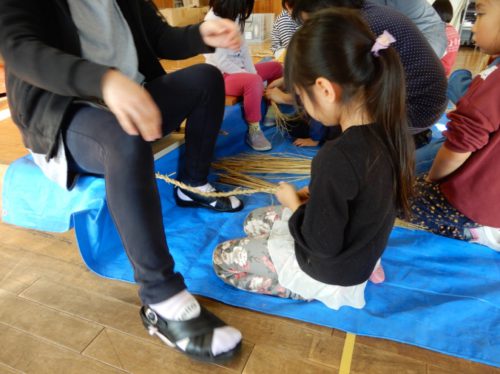 例年、収穫後の稲わらをもらい、やきいも会でおき作りに利用していますが、今年は、おじいちゃん先生に教えていただいて、しめ飾りを作る体験もしました。