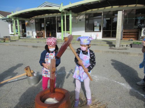 年長:田植え、稲刈りをして、もち米の収穫をすることで、もちつき会への期待を寄せ、良い経験ができました。刈ったわらでお正月飾りも作りました。作り方の説明は難しかったのですが、やってみると意外と上手にできて、子どもたちは真剣に取り組むことができ、良い思い出になったと思います。