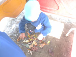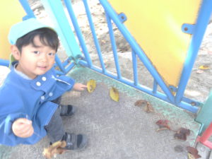 ・たくさんの葉っぱで遊ぶことができる季節で、おみやげやジュースなど、想像をふくらませ、いろいろなものに見立てて遊べていた。