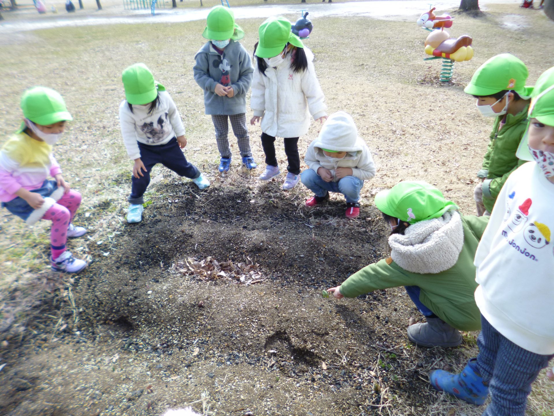 (3月)ぽかぽか暖かい日、再び何かを発見し、みんなで花壇に集まりました。