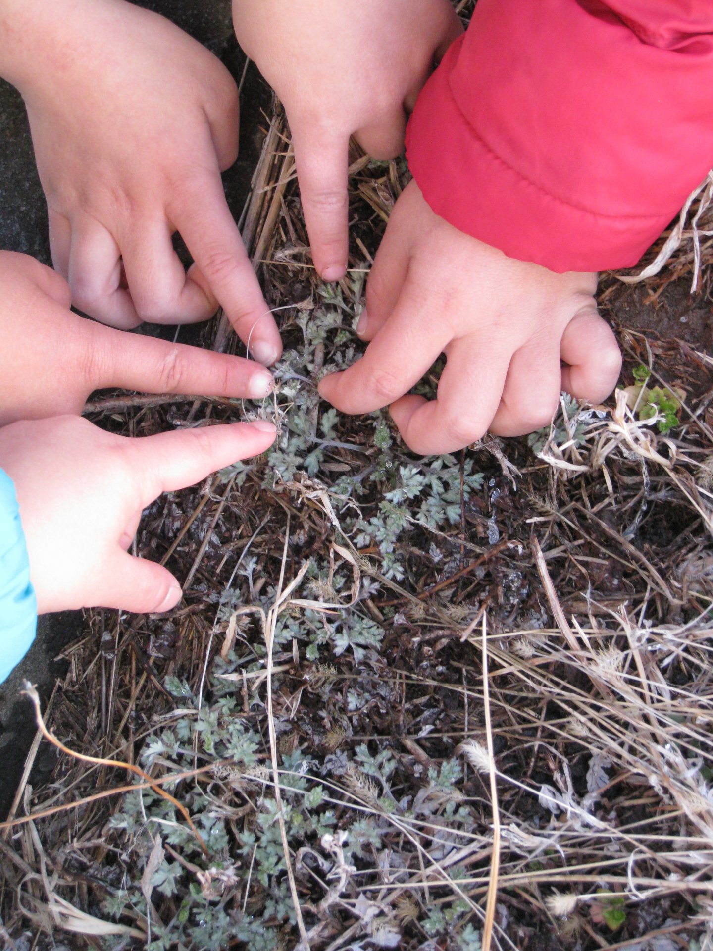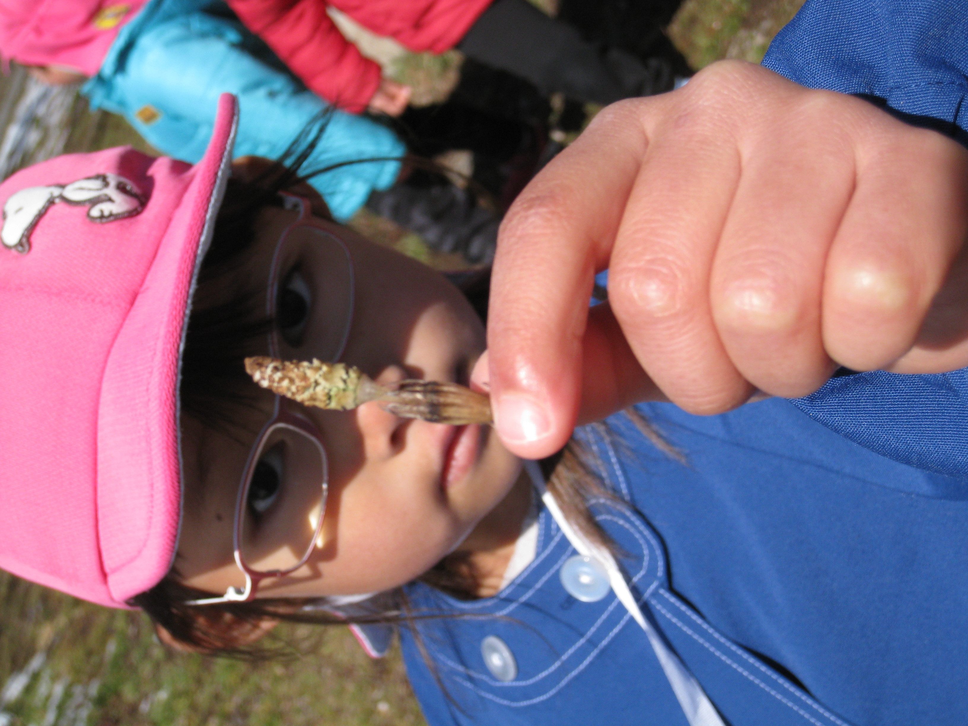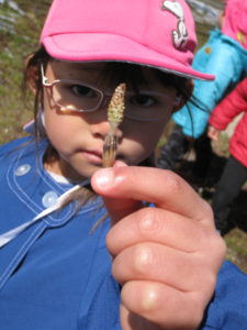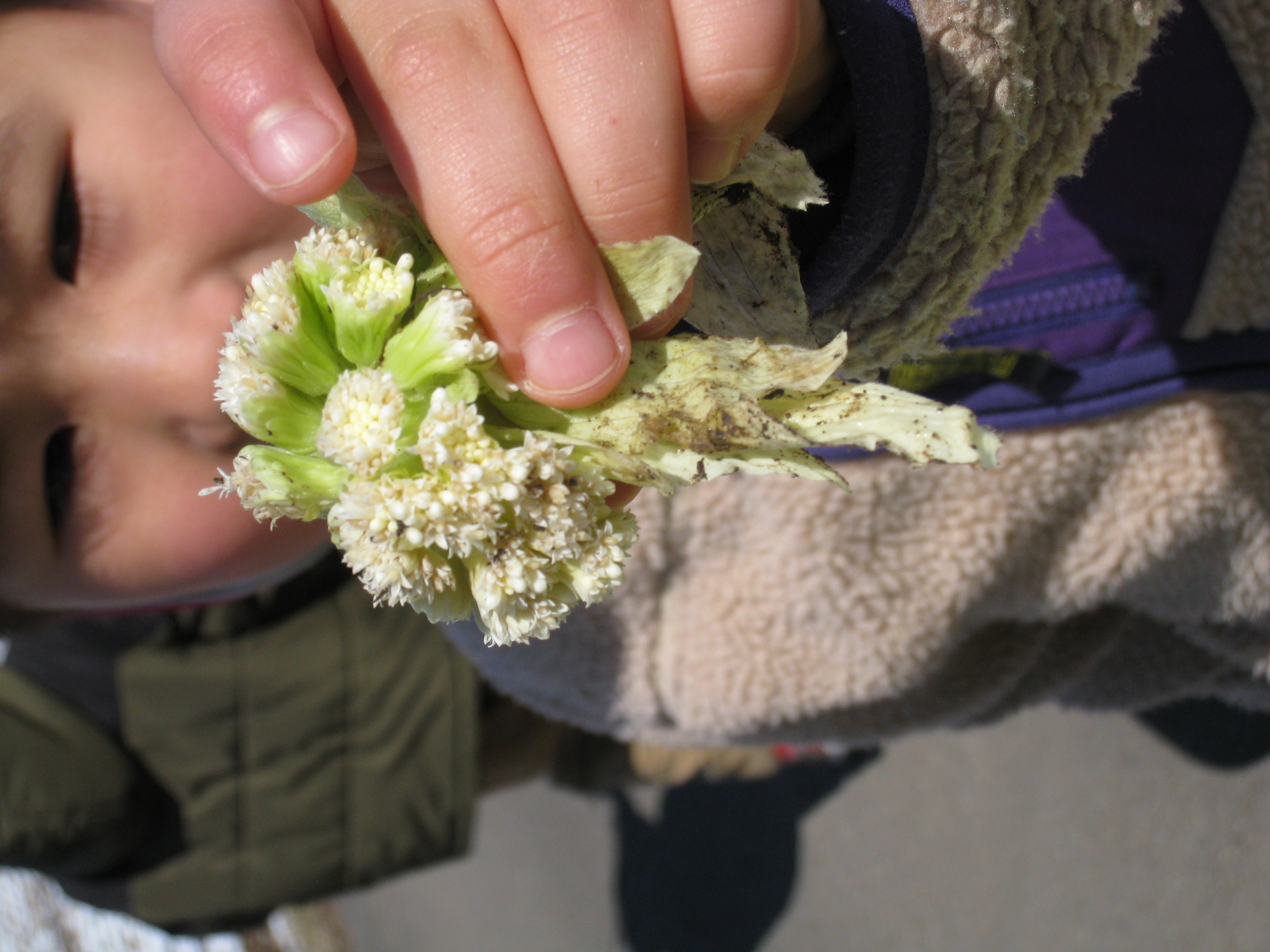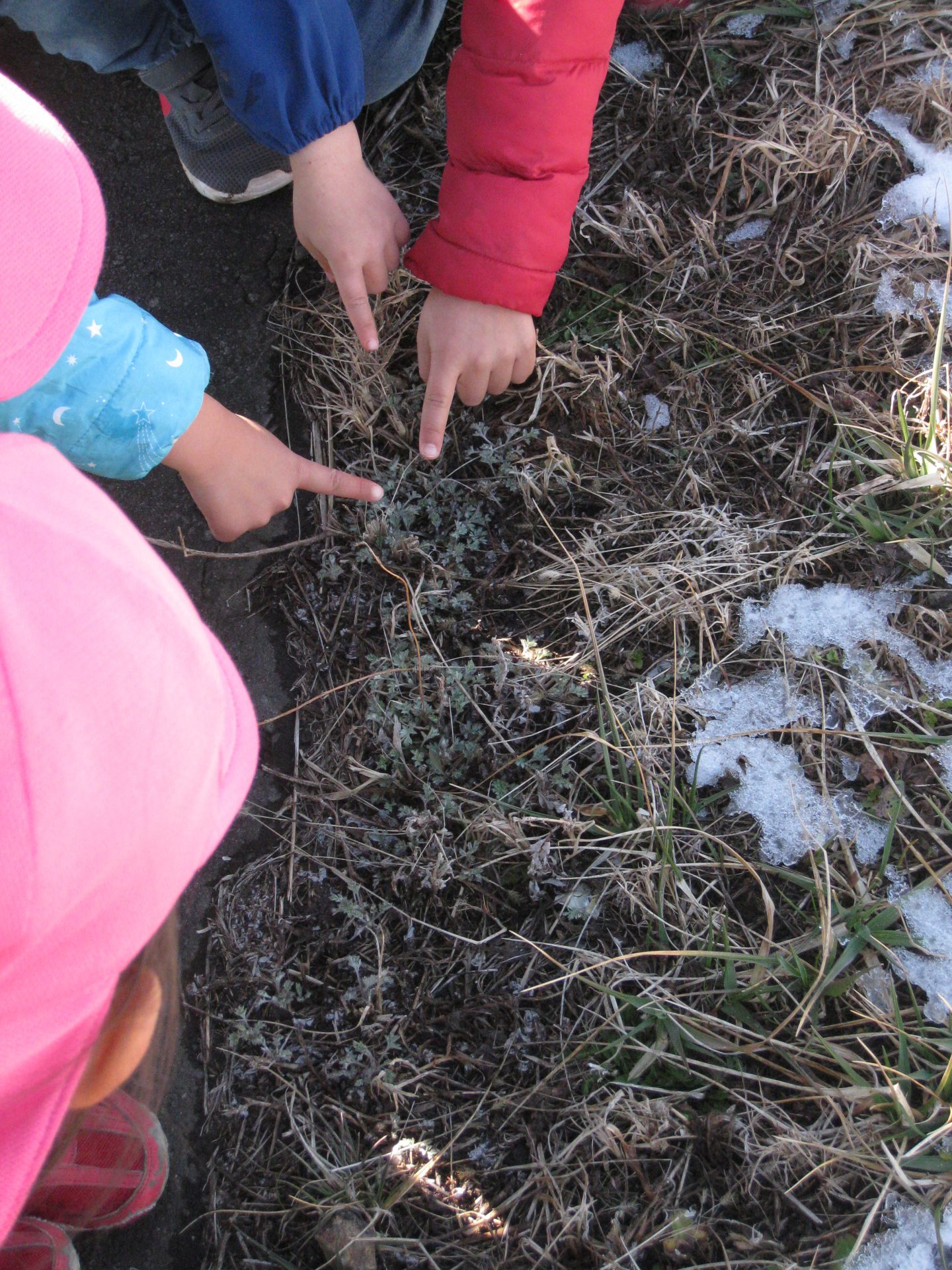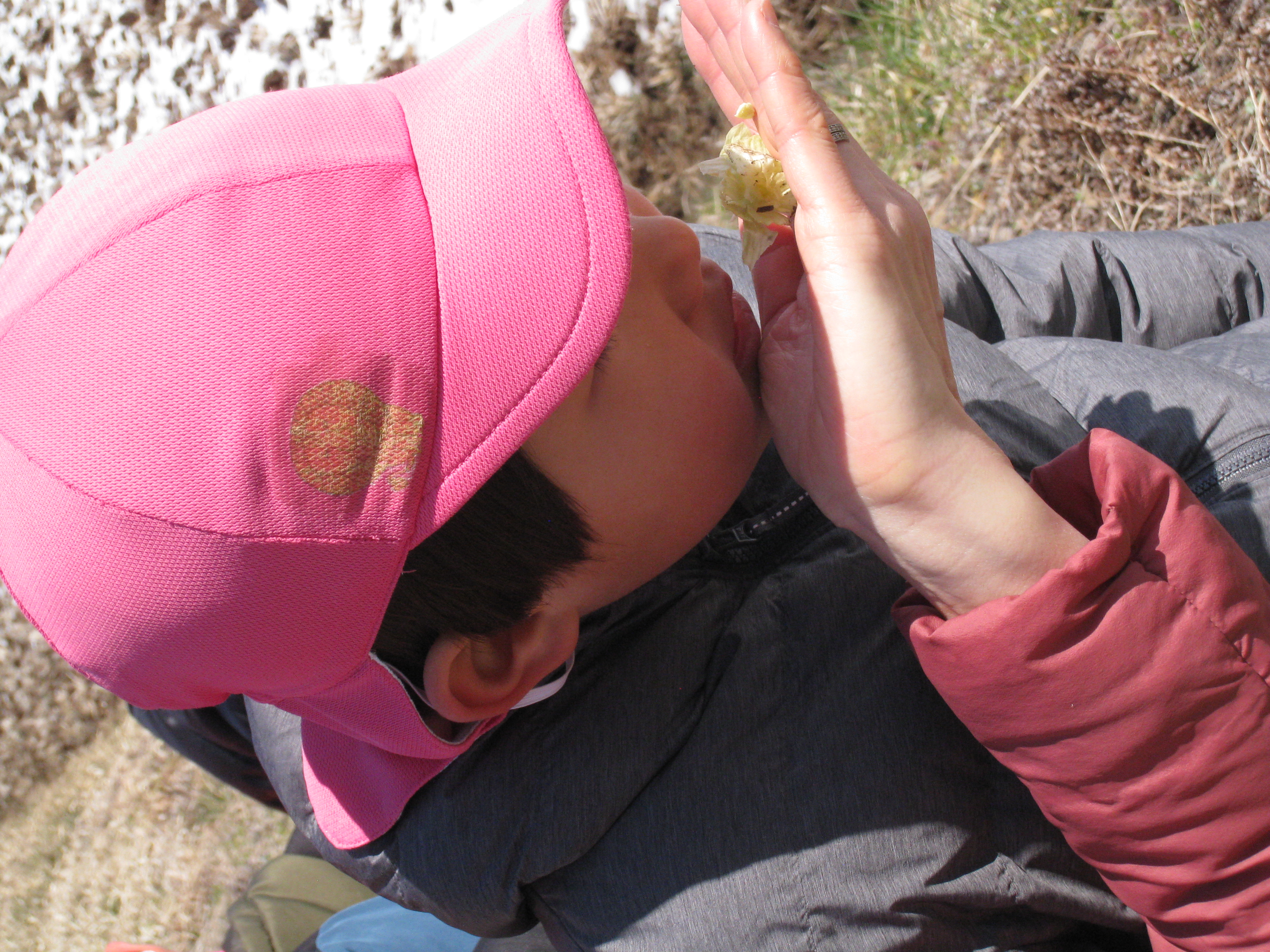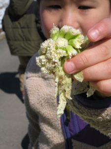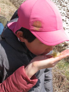 ・「これ知ってる、フキノトウだよ」匂いは・・・好きでない匂いだったようです。でも、どの子も、「嗅いでみたい」「私も」・・・と興味深々。
