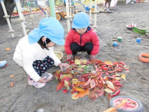 焼き芋大会の次の日、園庭に落ちていた桜の葉はオキ。大き目の石はさつま芋。