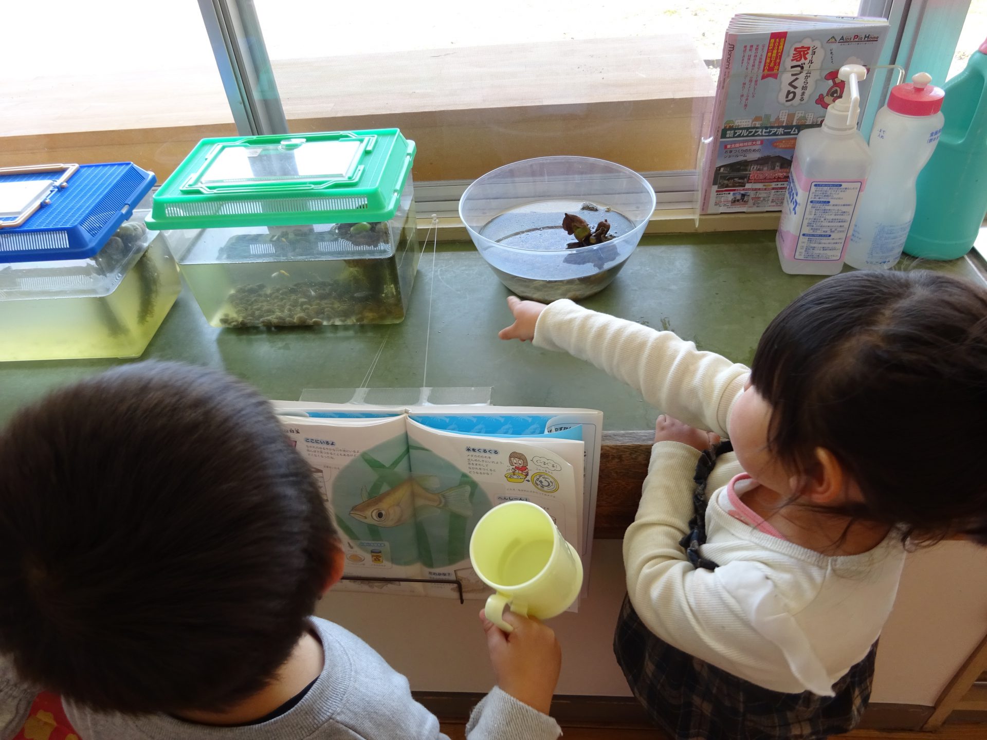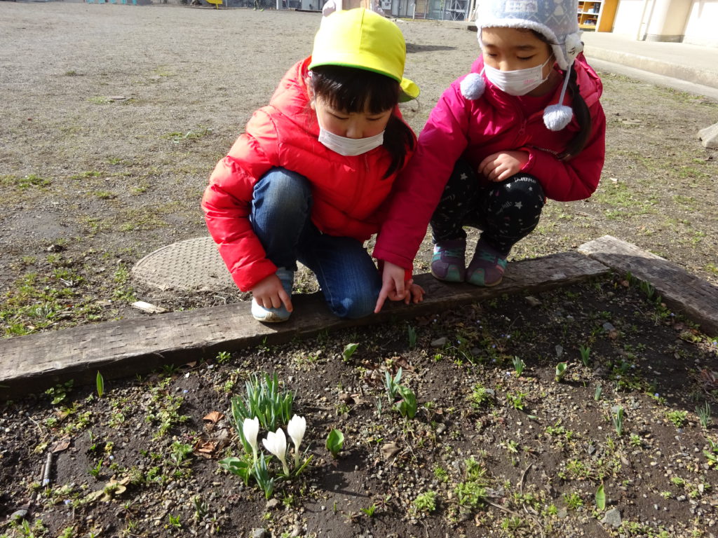 ふと、園庭で遊ぶ子ども達を見ると、花壇を真剣に見ている年長さんの女の子が二人。