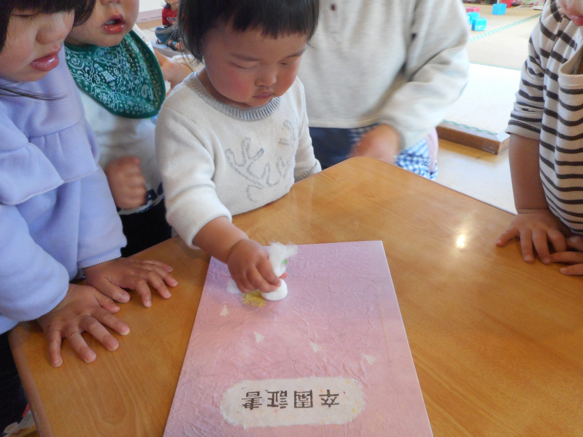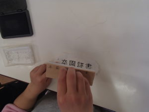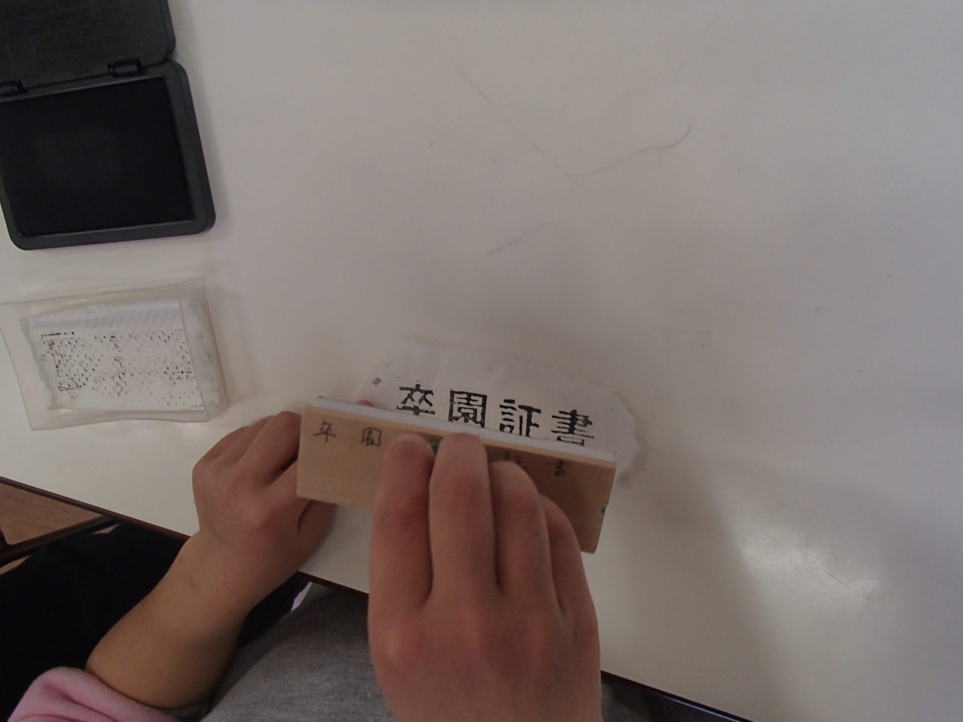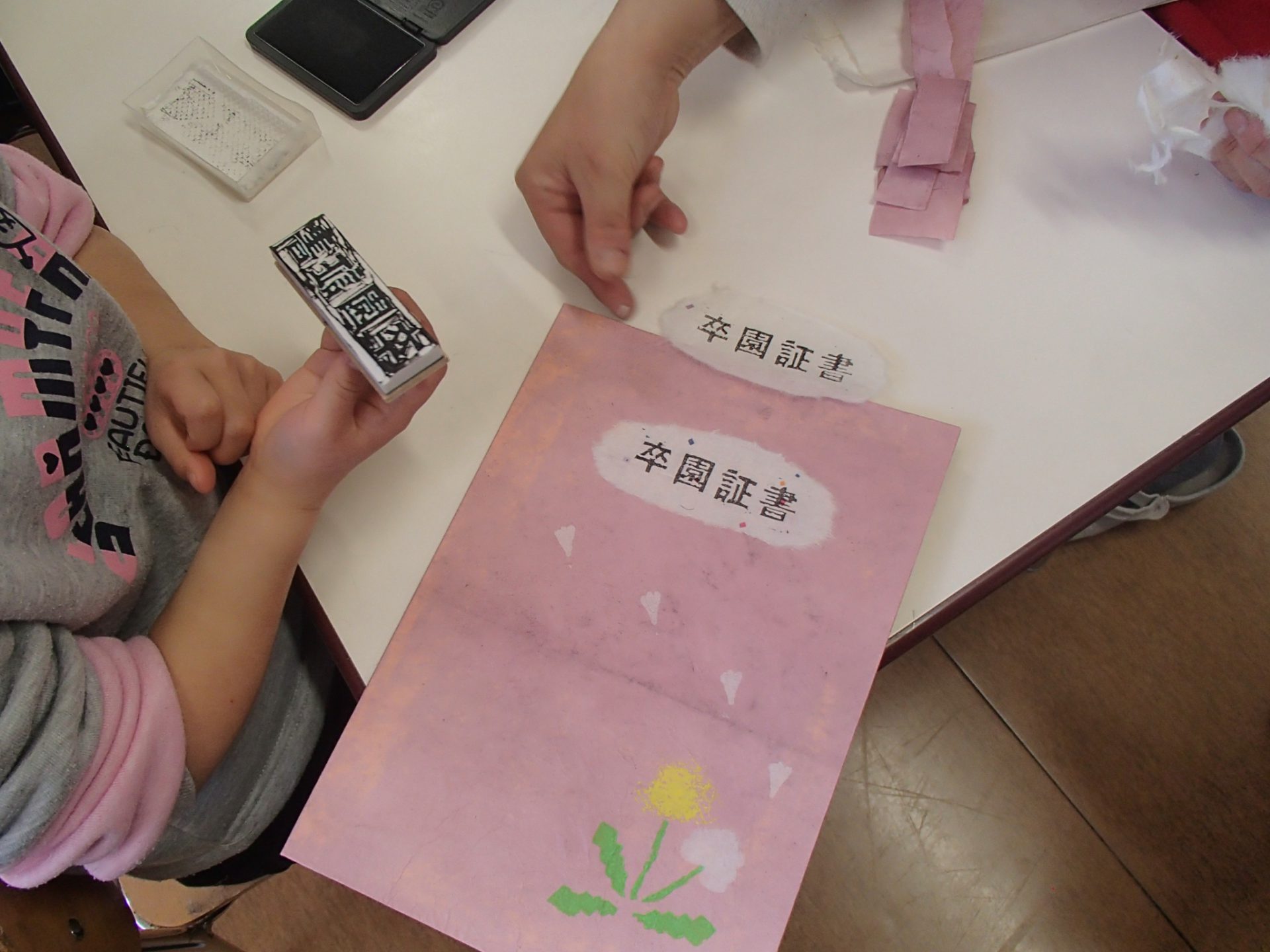 そして、おじいちゃん先生が作ってくれた「卒園証書」の消しゴムはんこをつきます。