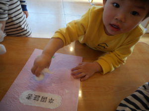 小さな手でステンシルをした未満児の子ども達の思いが年長さんに届きますように。