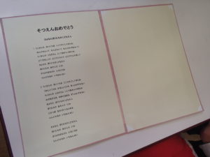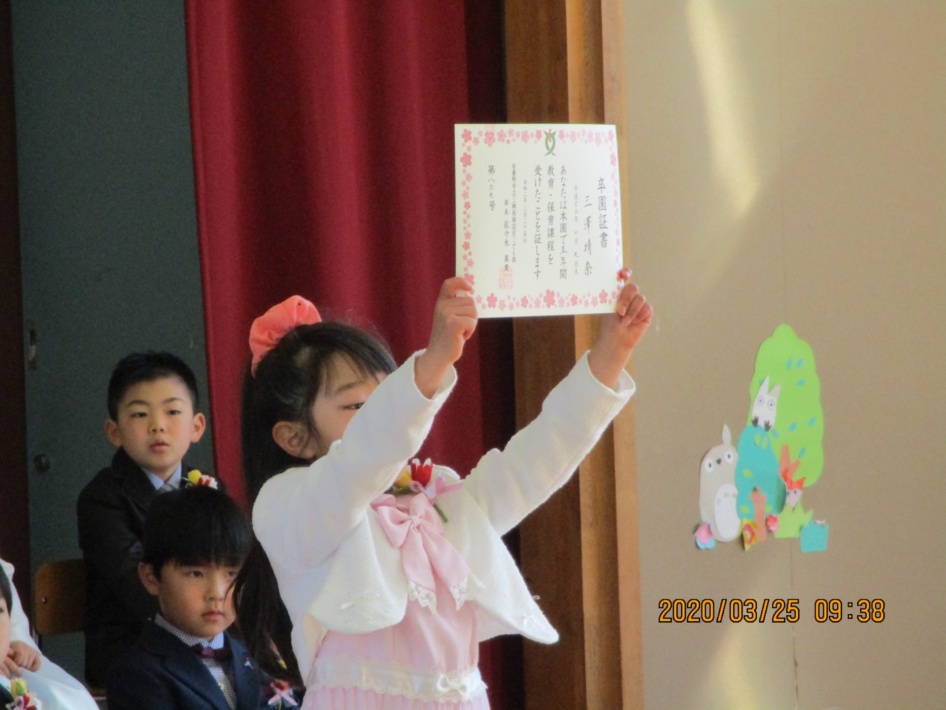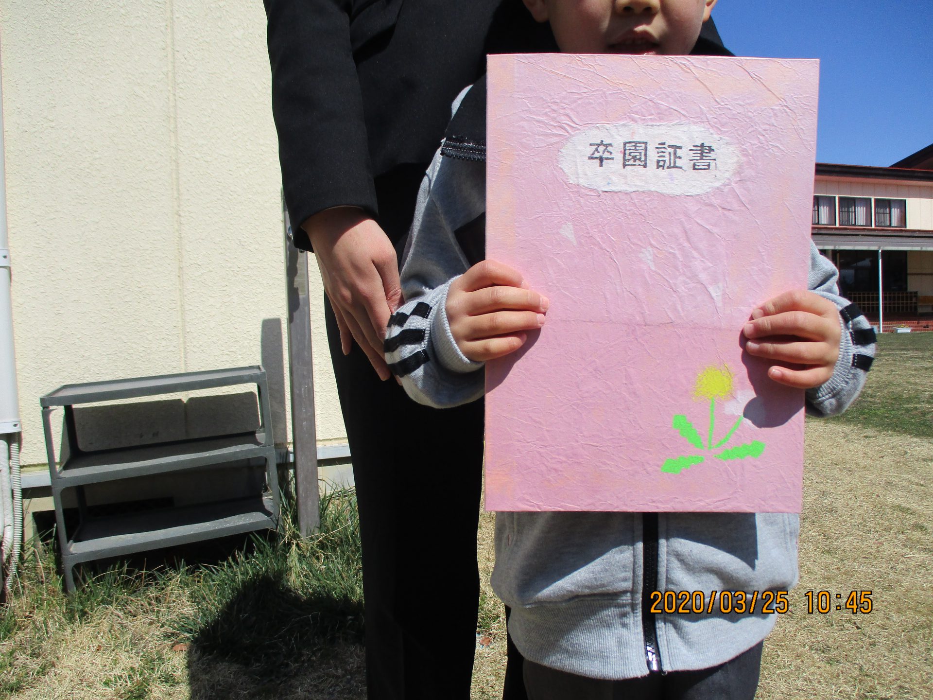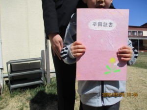 卒園式当日。子ども達は園長先生から立派に卒園証書を頂き、大好きなお家の方の元に届けました。