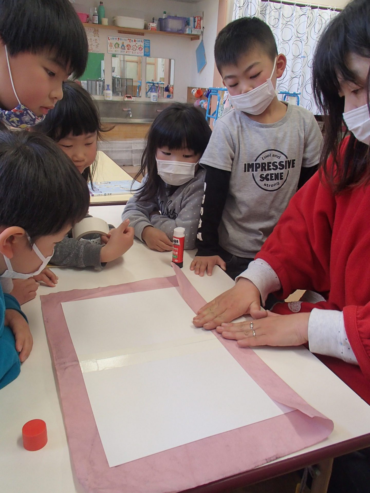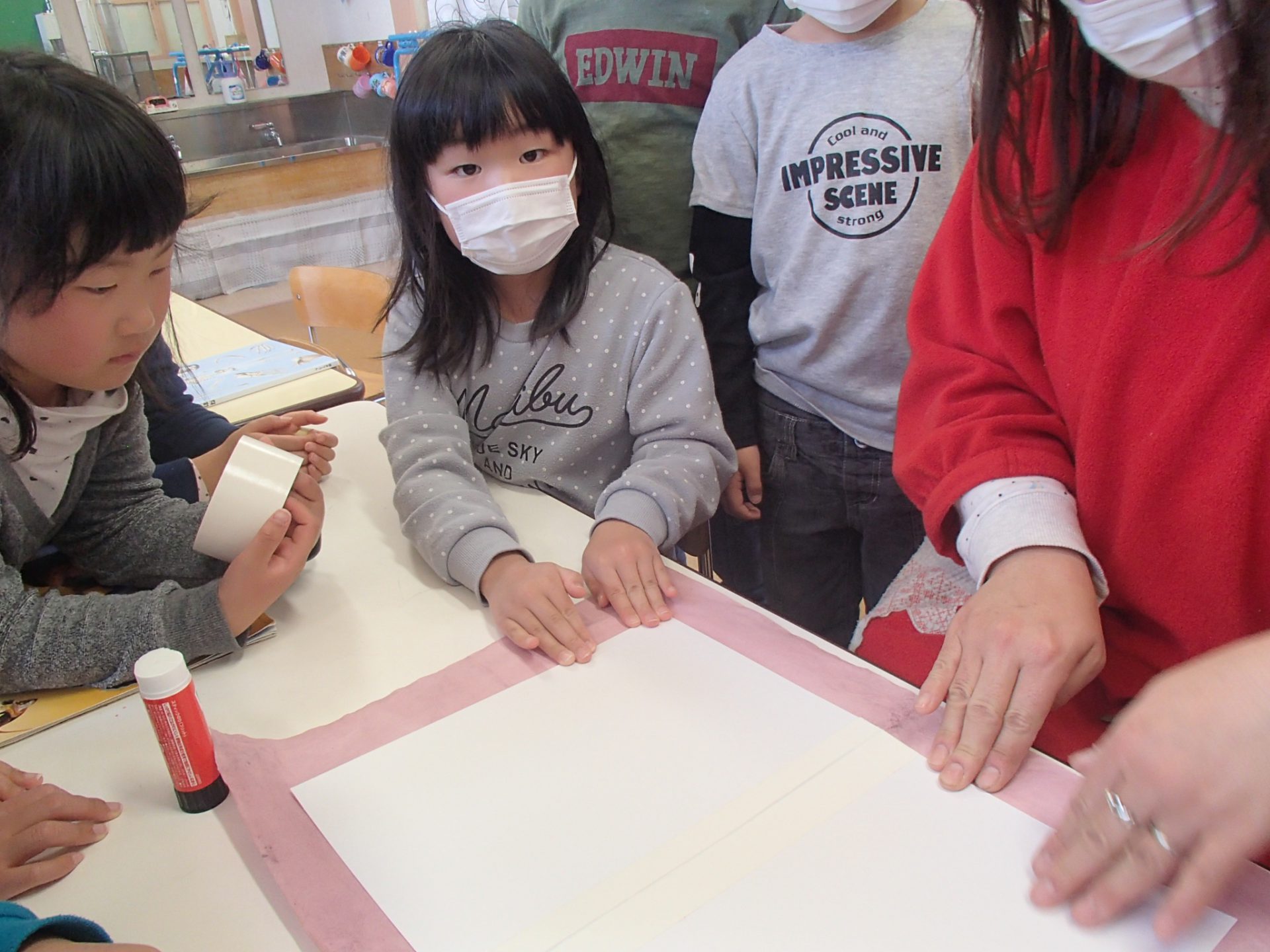 先生や友だちと協力しながら、厚紙に貼っていきます。