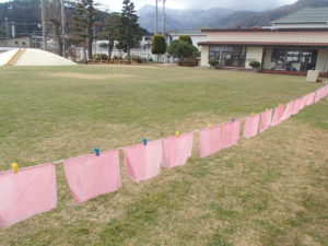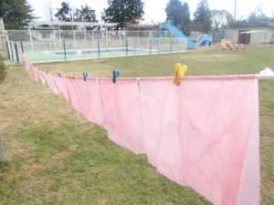 運動会の万国旗作りに使用した”しそジュース”を再利用して、卒園証書入れを作ることにしました。
