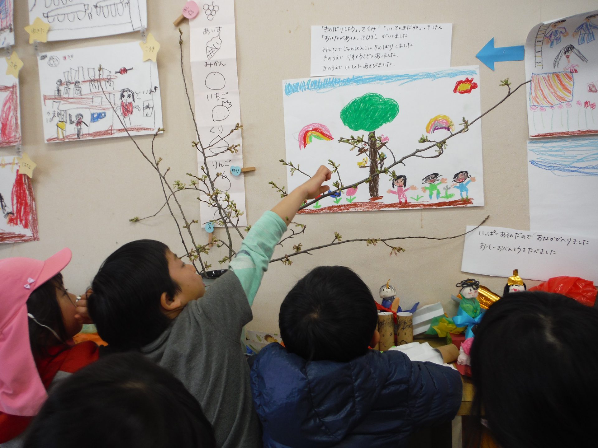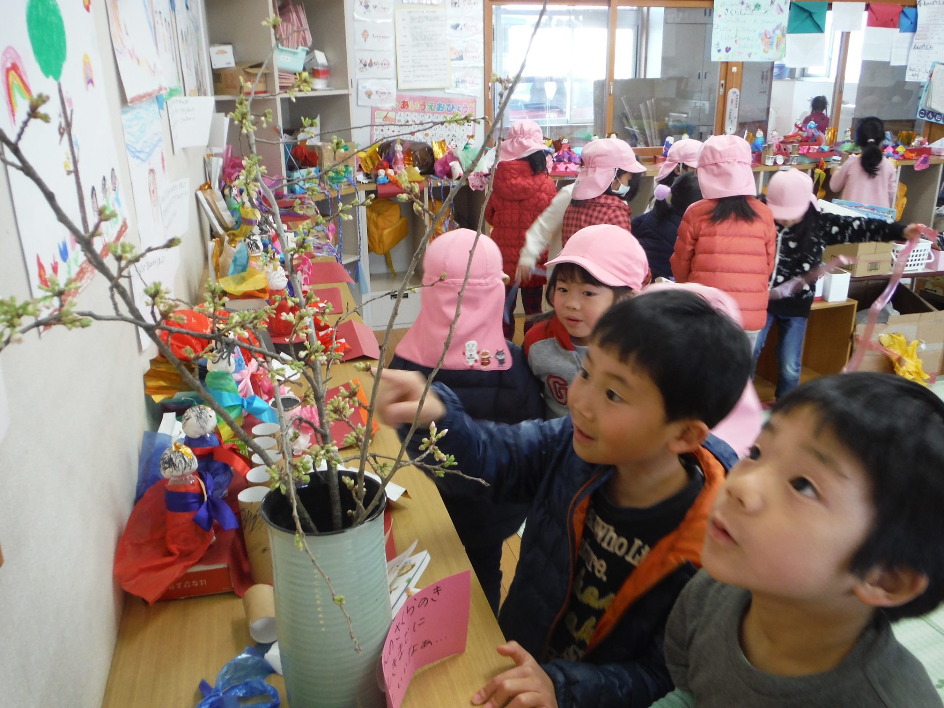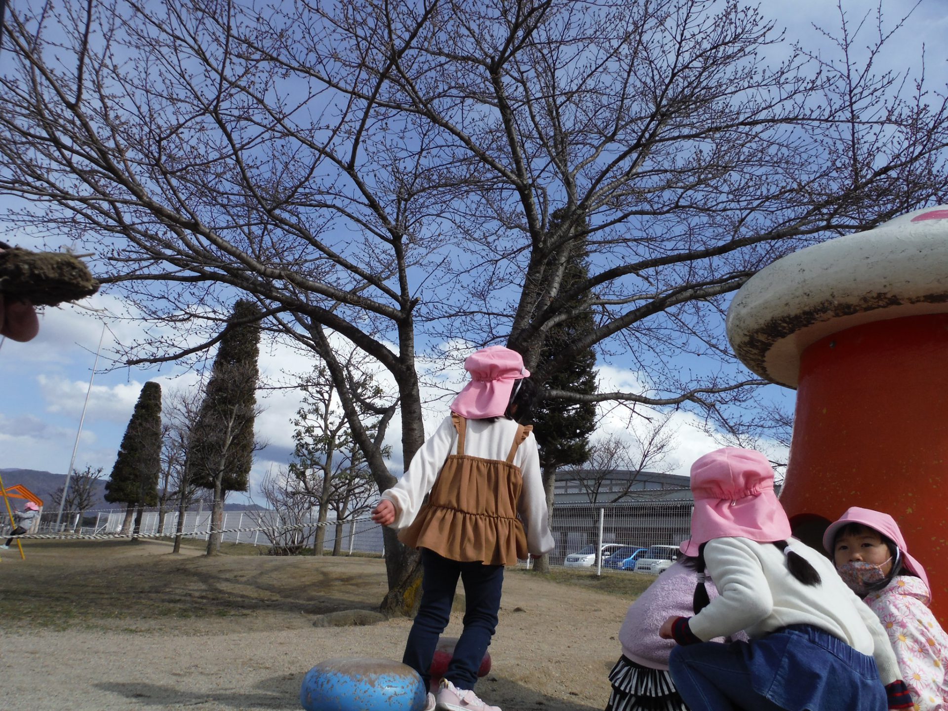 2月のある日、桜の木を見て「早く咲かないかな?」「桜が咲くのは春だから小学生になった時だよ!」「じゃぁ見れないの!?」と話す声が聞こえてきました。