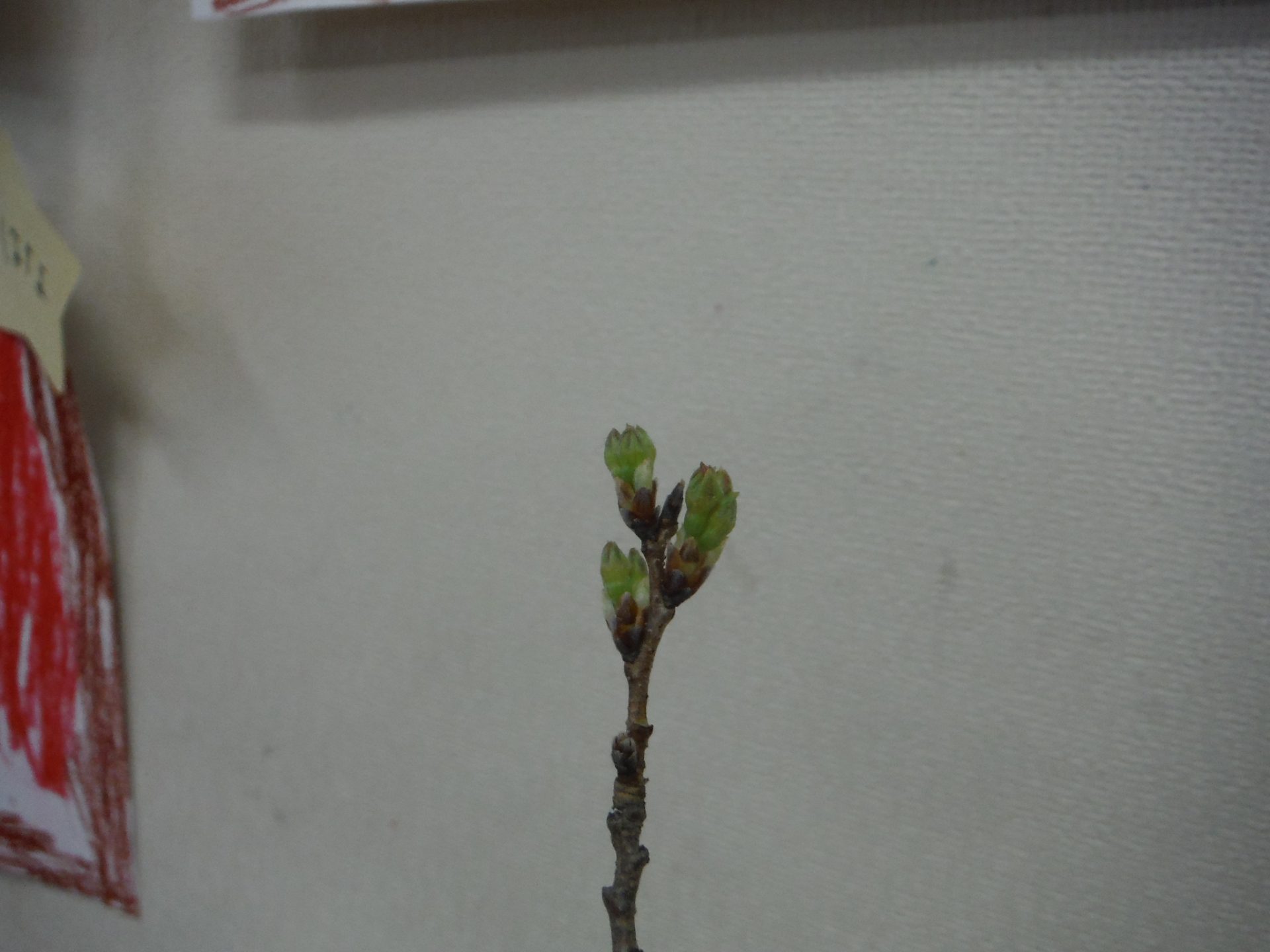 部屋の暖かさに誘われて桜の木の蕾が緑に膨らんできました。