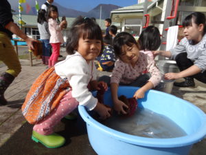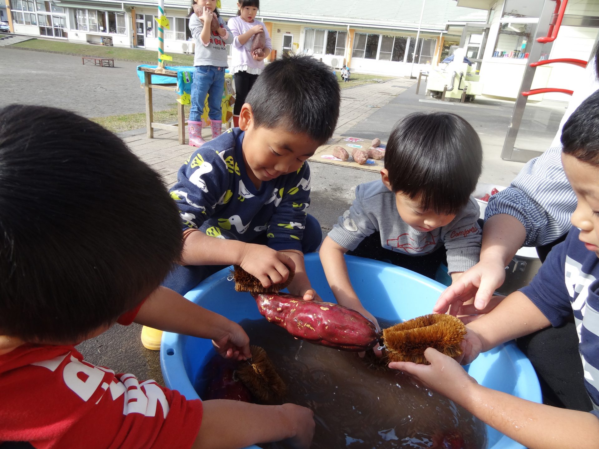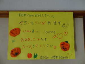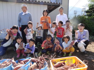 青木村保育園では毎年、ばらぐみとひまわりぐみさんがさつまいもを育てて、焼きいも会を計画しています。