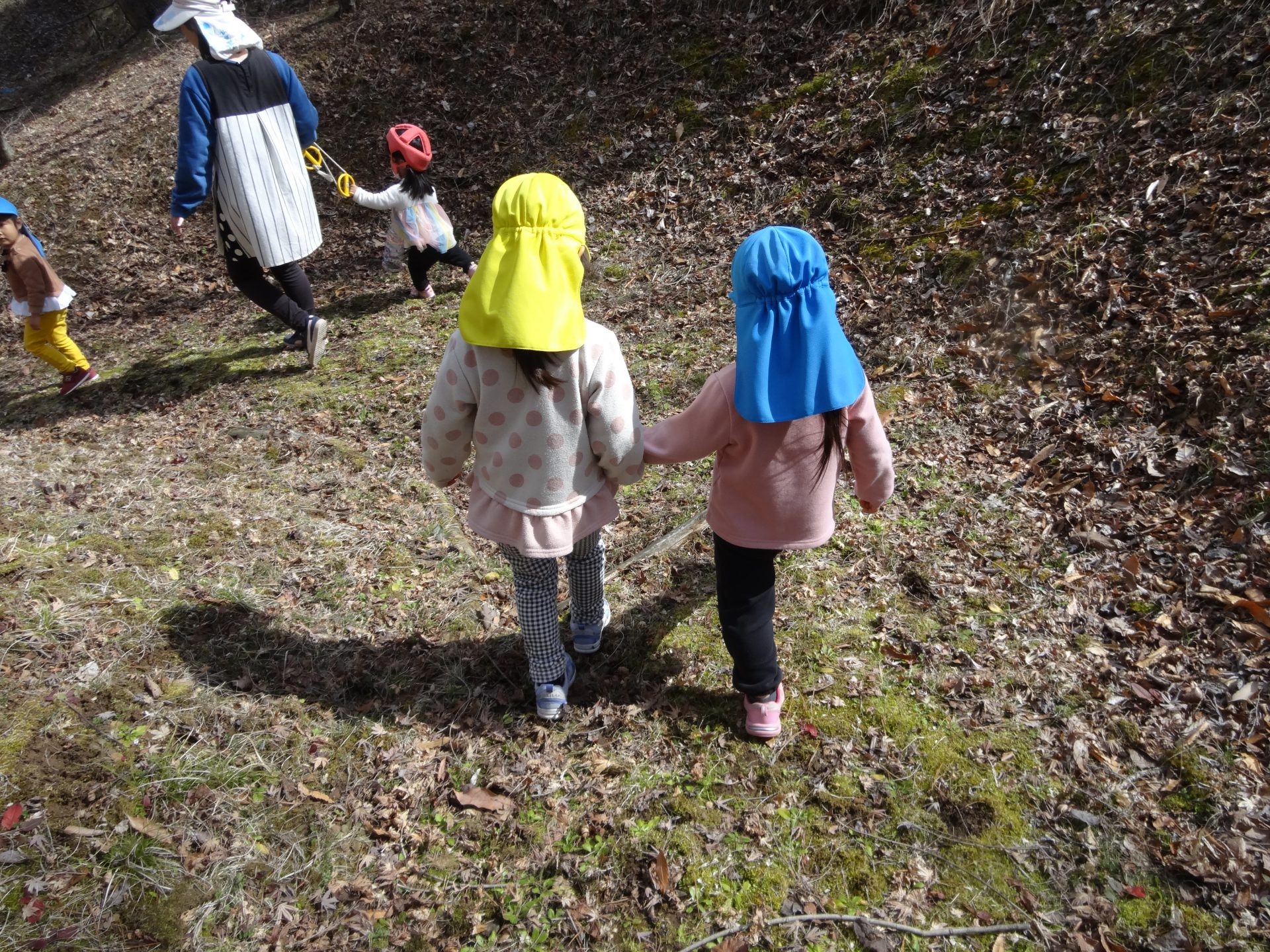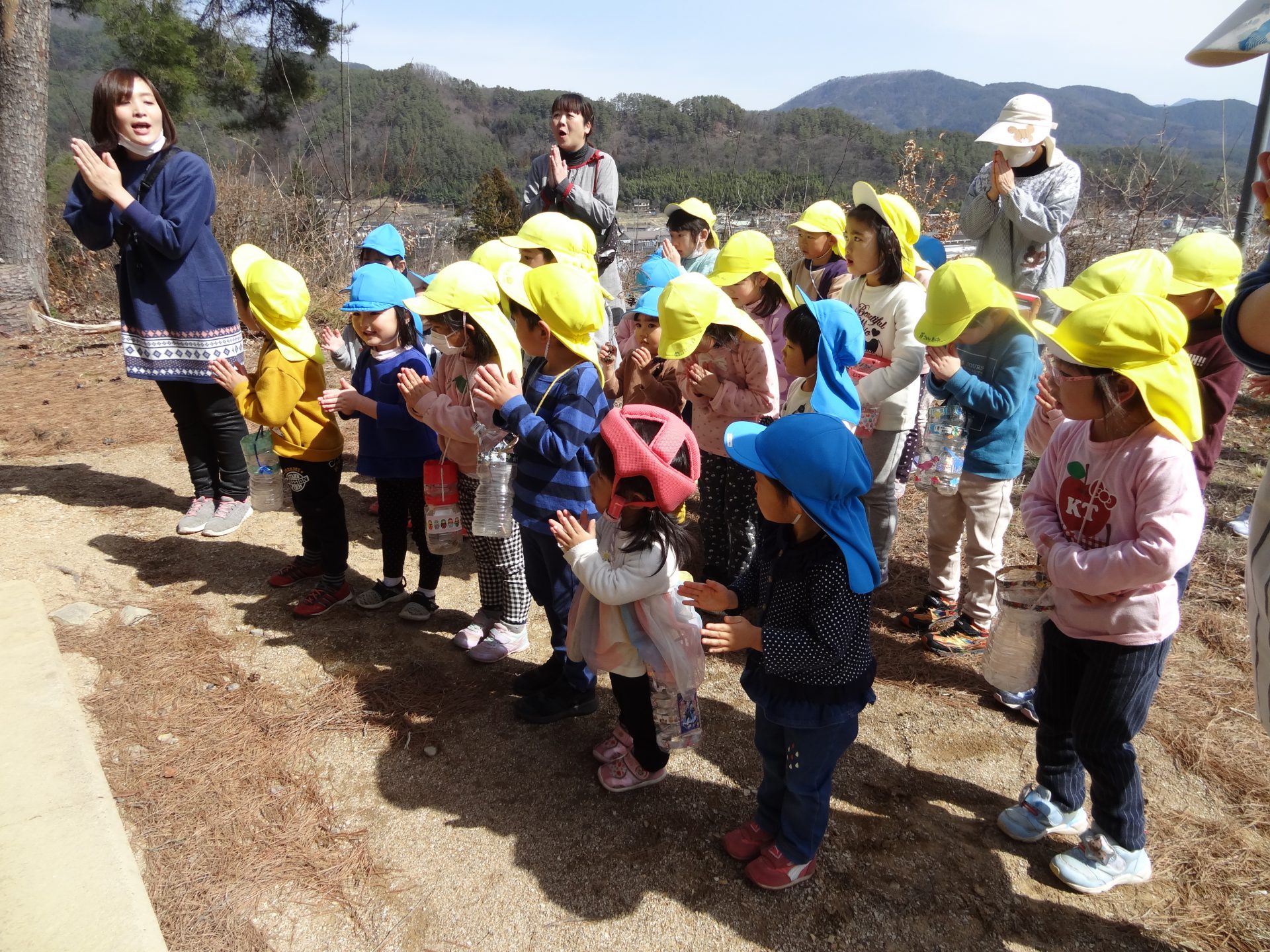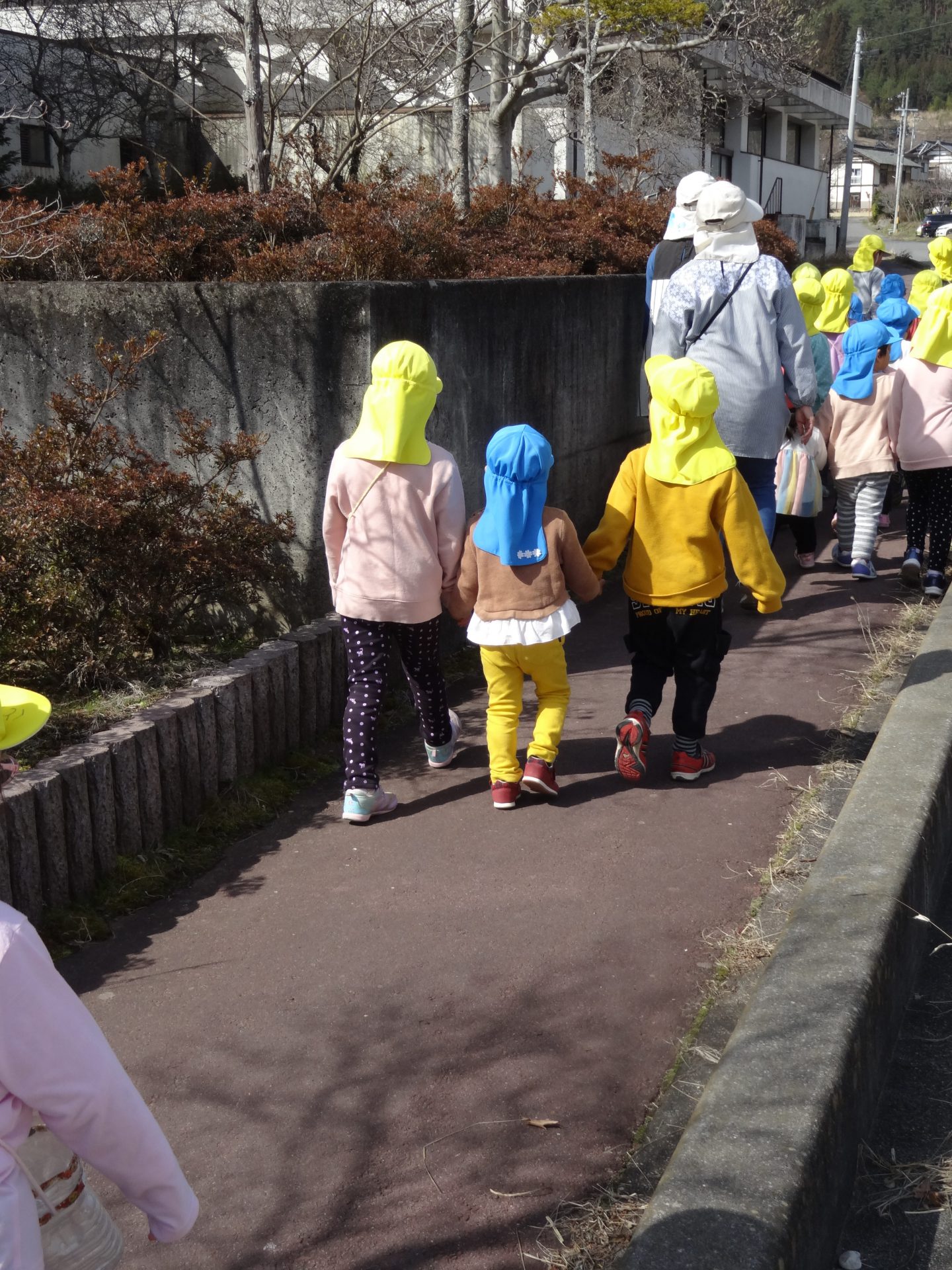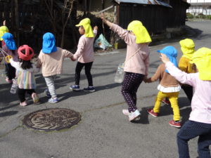 3月のよく晴れた日に、年中組のひまわり・ばらぐみと、2歳児ぐみのちゅうりっぷぐみとたんぽぽぐみで、春を探しにお散歩にいきました。