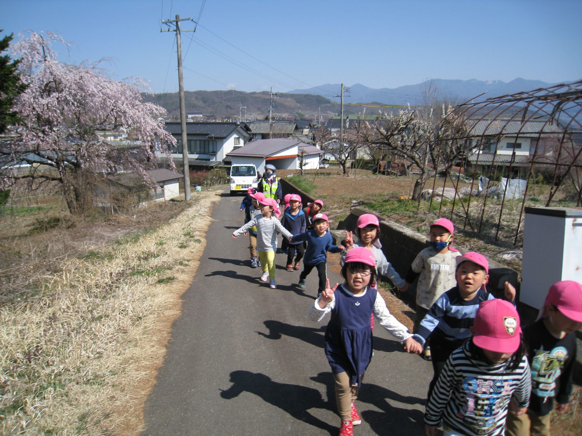 とぽかぽか陽気の中、春を感じながら歩く子ども達。