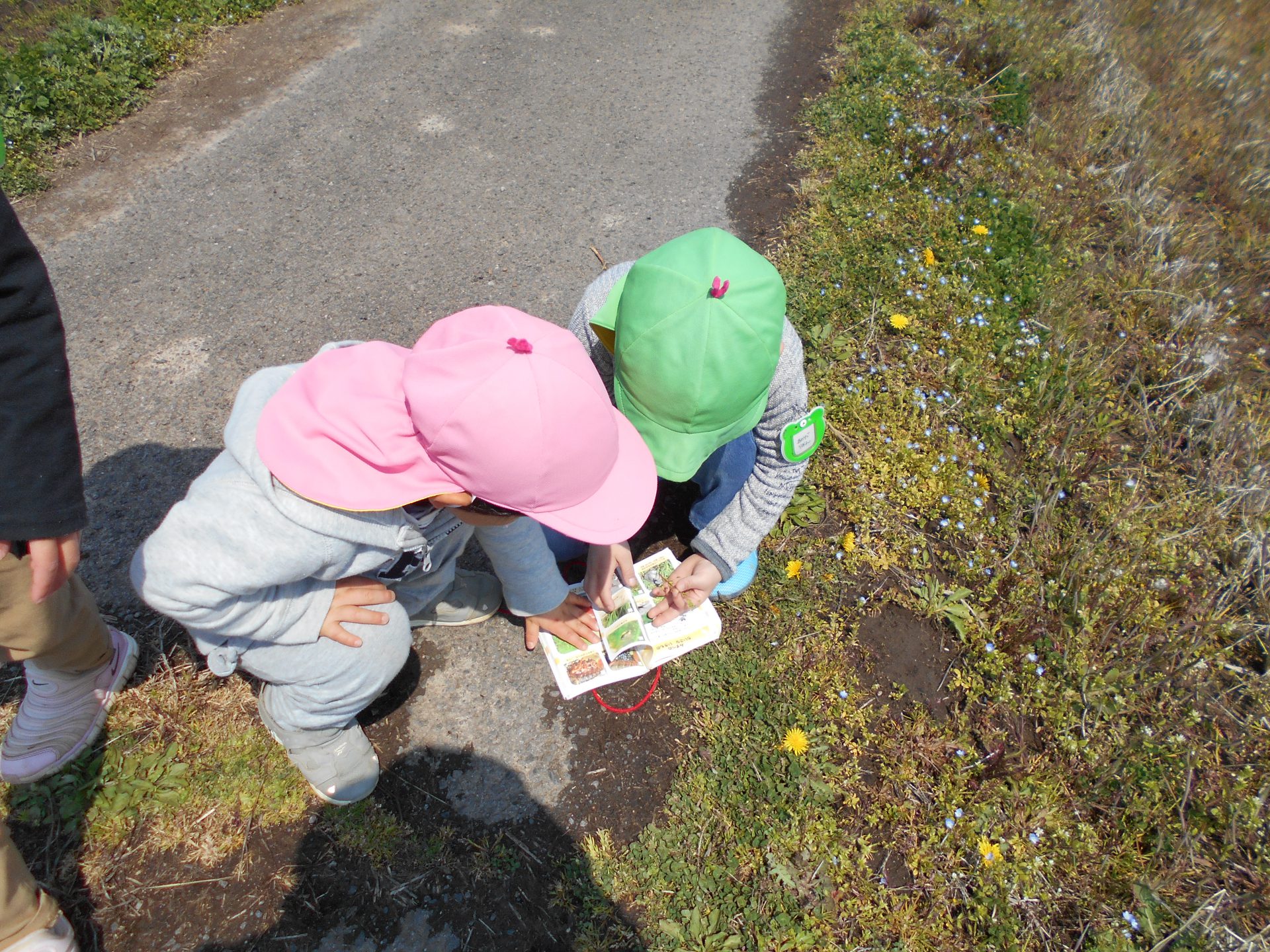 土手や畔道でつくし、たんぽぽ、ナズナ、よもぎなど見つけてはポケット図鑑をのぞきながら話がはずみます。