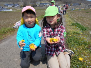 「見て見て!このはっぱ、くっつくよ。」「こんな大きなたんぽぽあったよ」