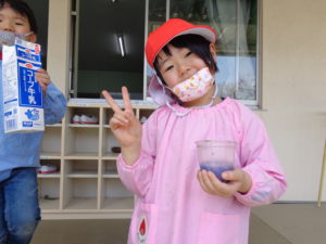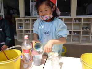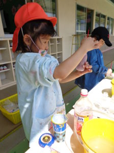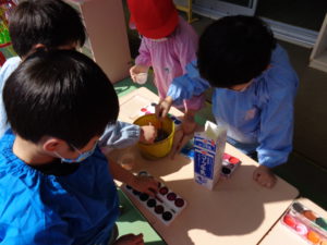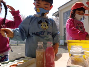 色の変化を楽しむ子ども達。緑は「ミントだ!」と言ってミント味のジュースを作る男の子、「チョコミントにしよっと。」と言って茶色を混ぜ始めました。出来上がると「先生!チョコミント味!どうぞ」と言って差し出してくれました。(ピンクを作るには)「赤と白を混ぜるんだよね?」と昨年、絵の具研究をして学んだことを生かす子ども達の姿が見られました。