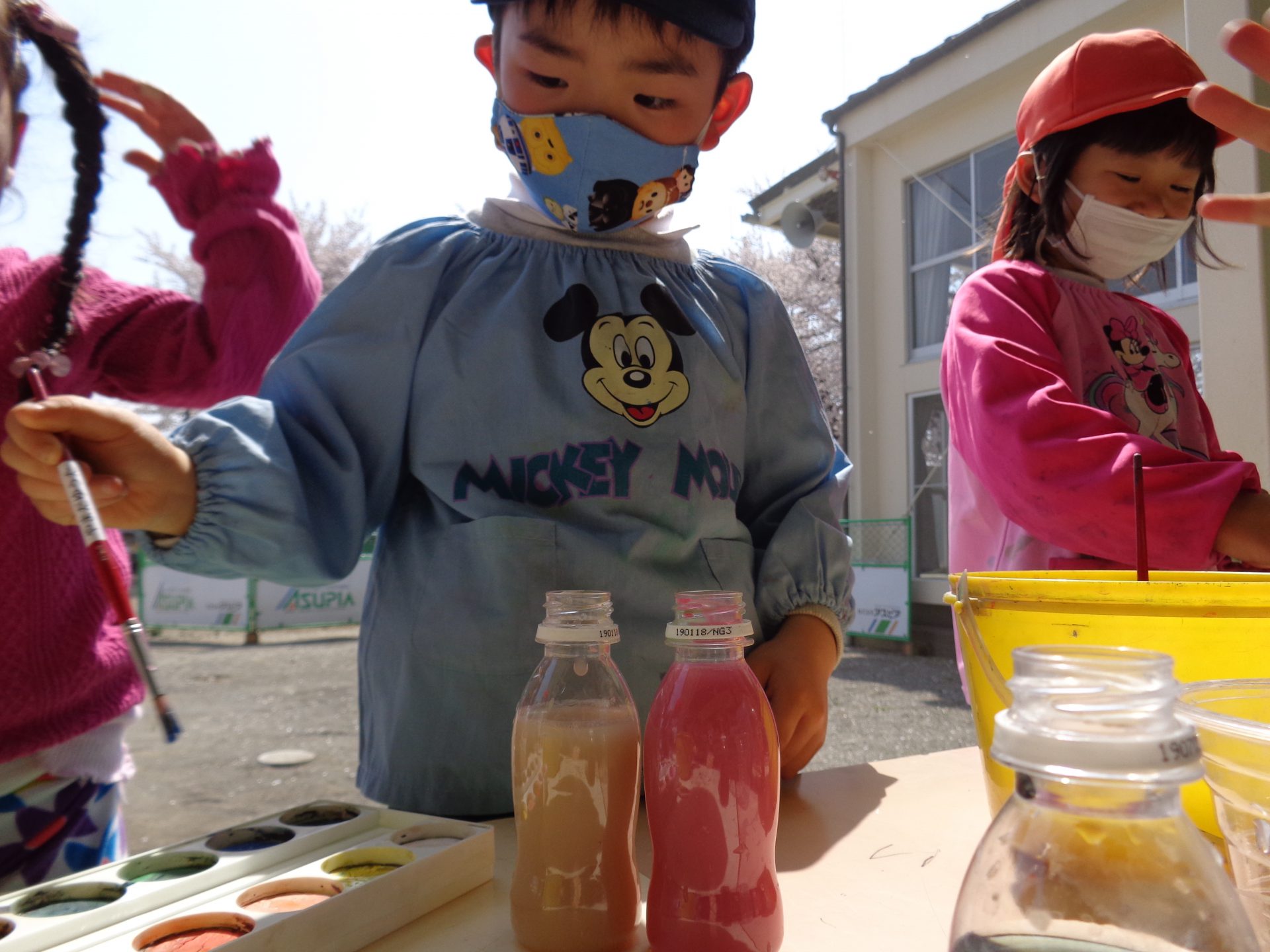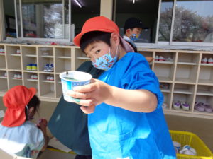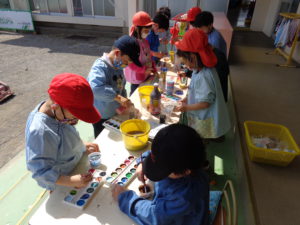 暖かい日が続いている今日この頃・・ 子ども達から「絵の具がしたい!」と言う提案があり、午後の遊びの時間で色水遊びをすることにしました。カップやヤクルトの容器に水を入れ、絵の具で色を付ける子ども達・・
