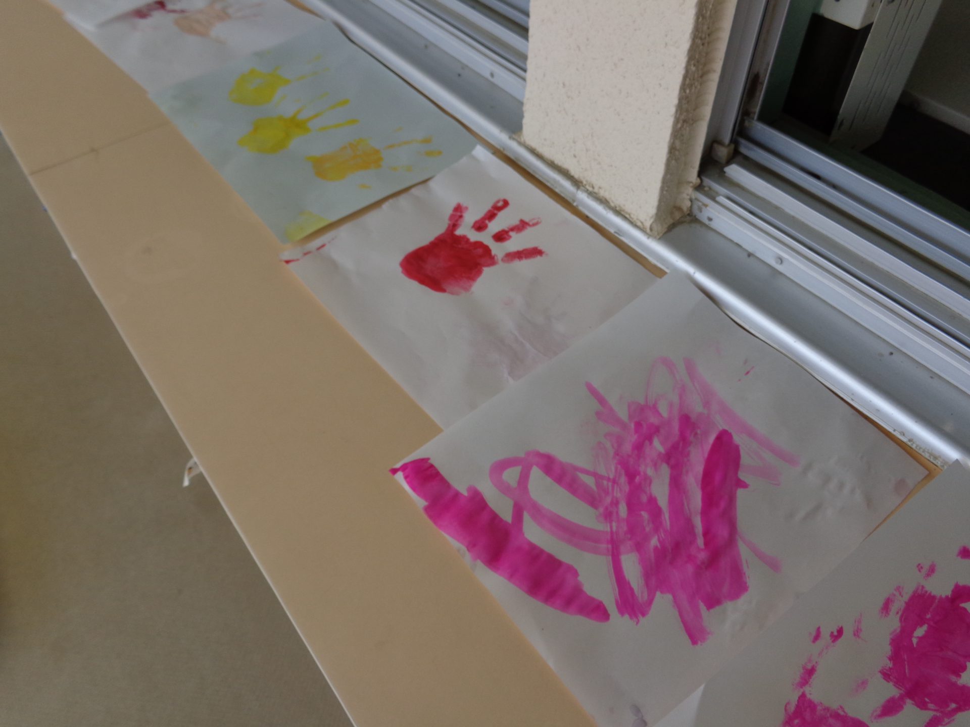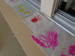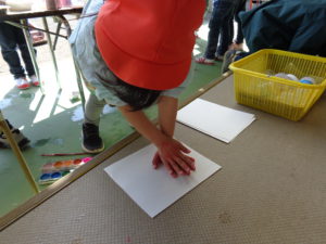色水作りをしながらある一人の女の子は手に塗り始め、「血の手形だ~!」と手形遊びが始まりました。