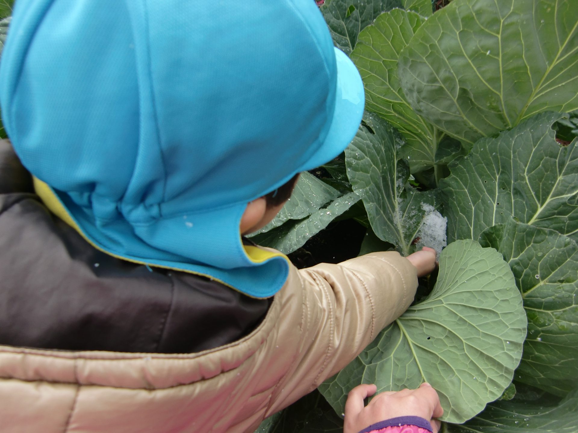 「あ!キャベツの葉っぱに雪が積もってる!!」