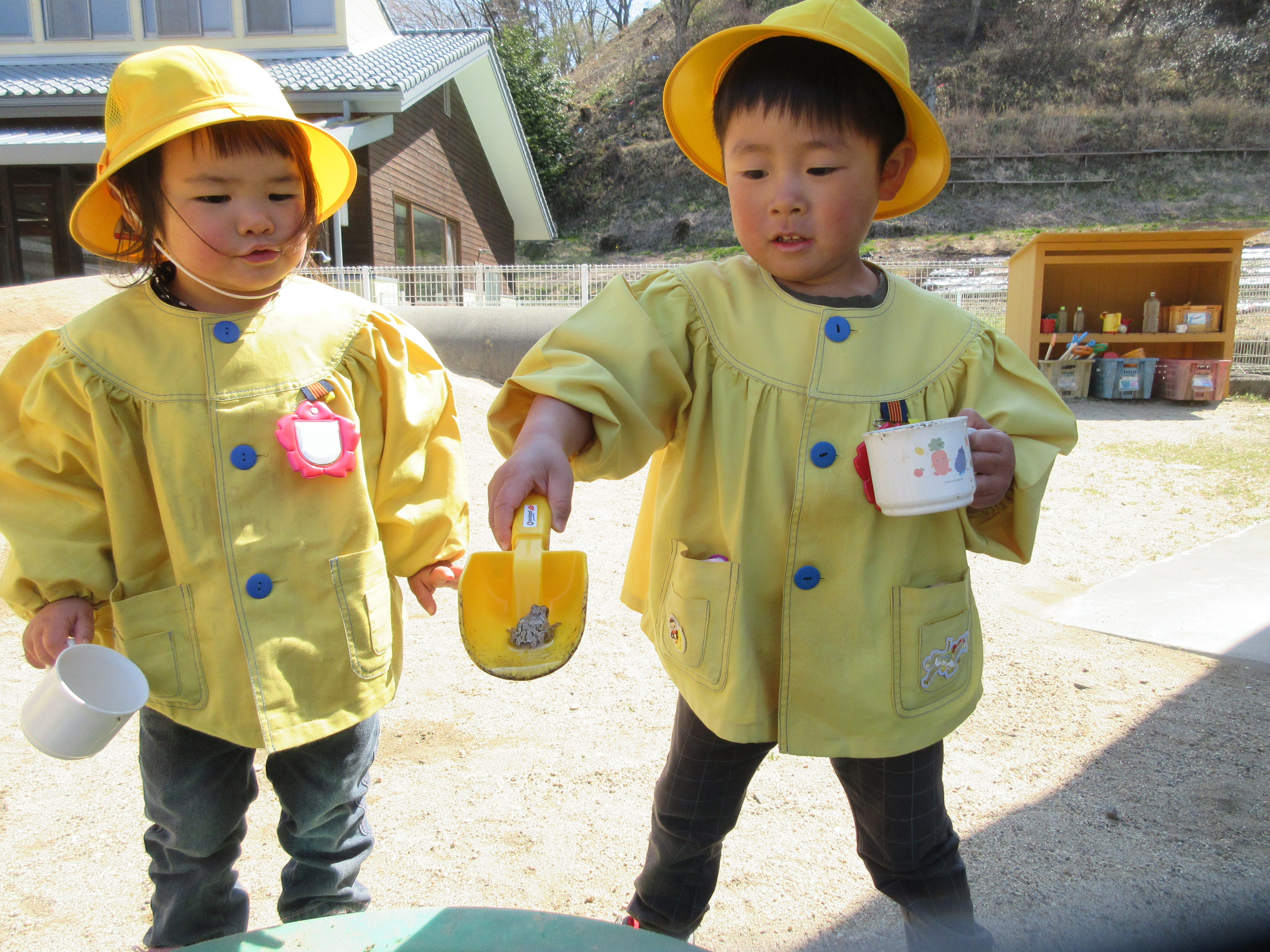 ショベルで掘る子もいれば、小さなショベルカーを持ってきて、「ウイーン、ガシャン!」と工事の真似をする子もいます。