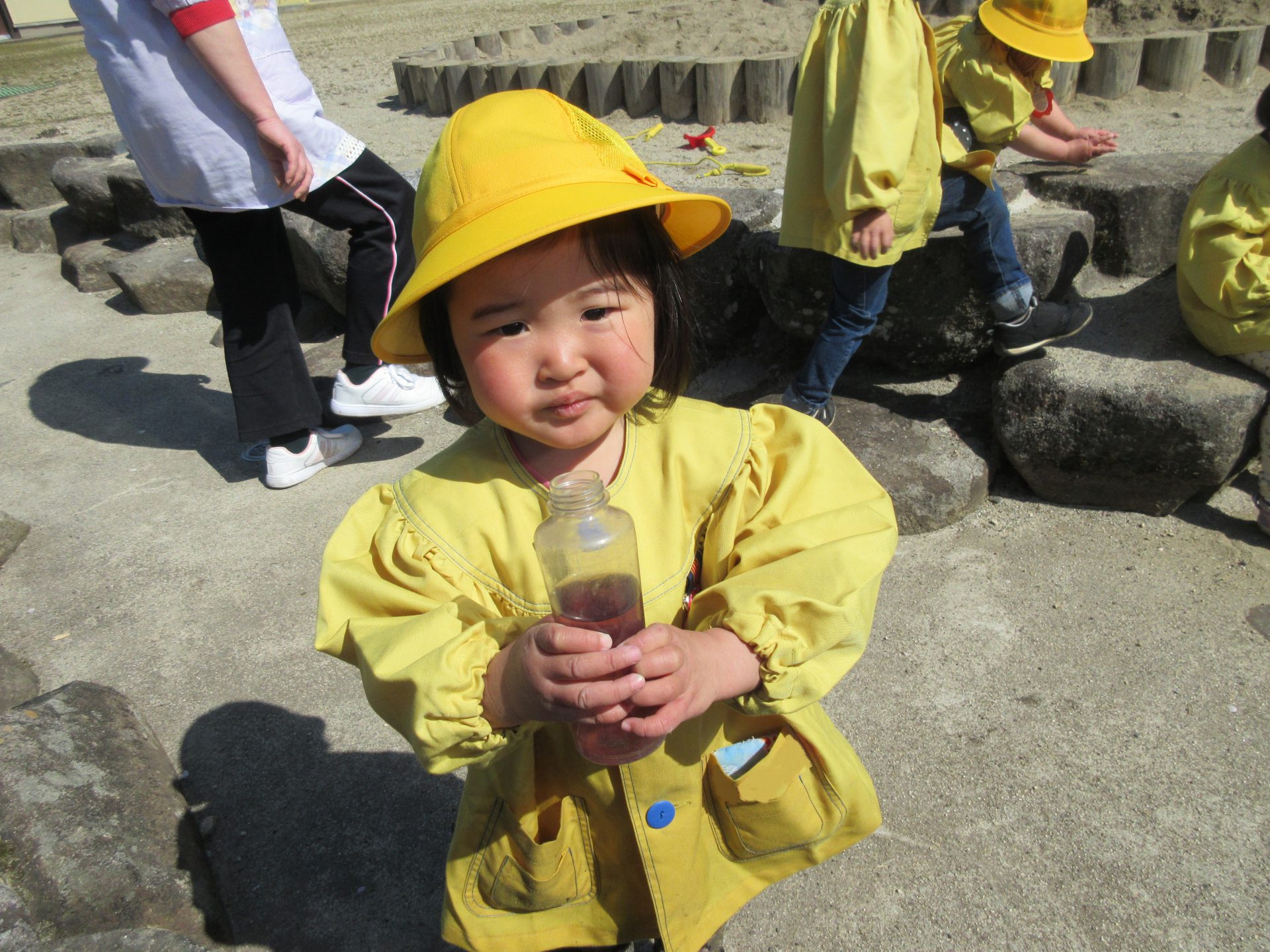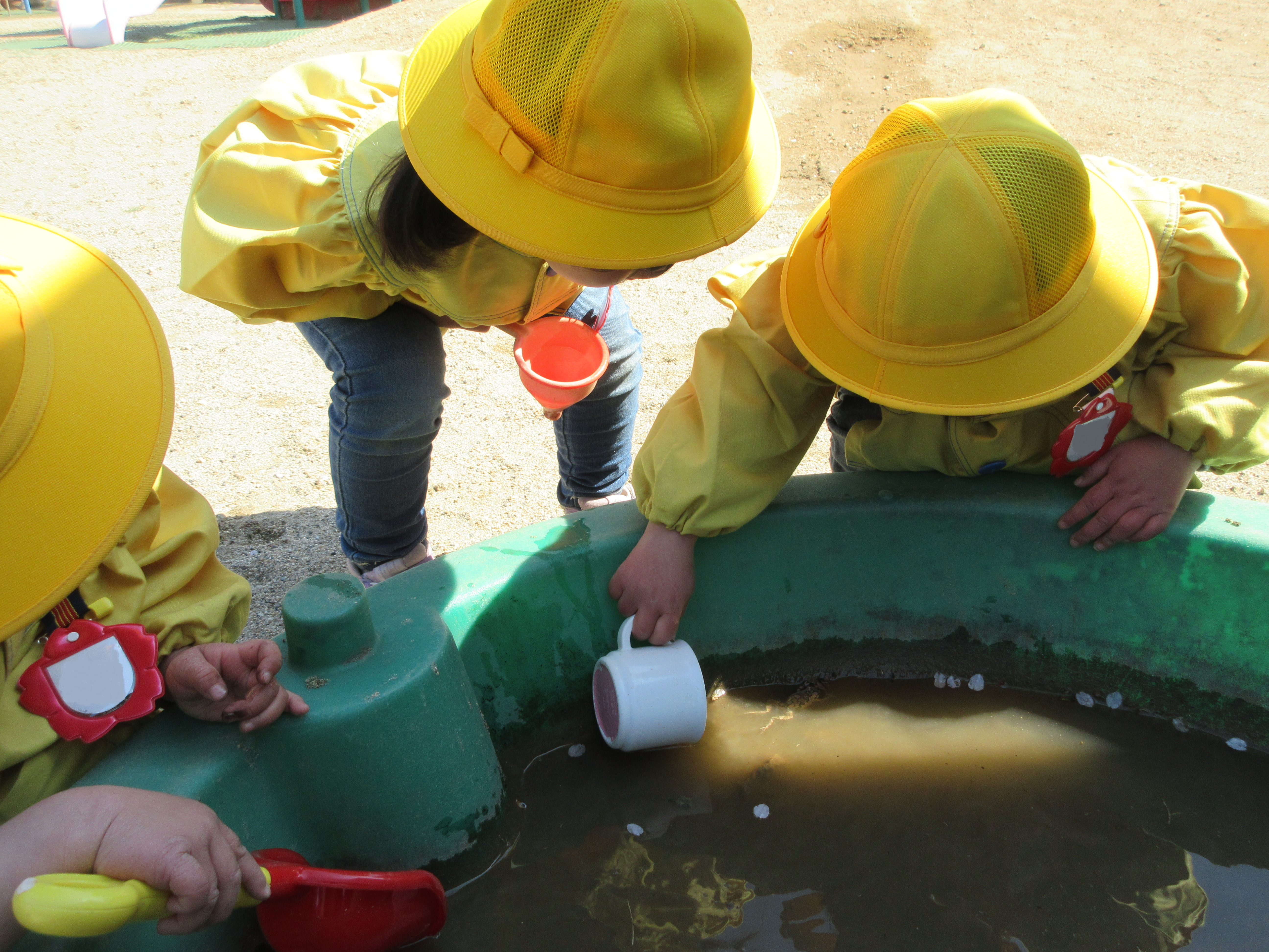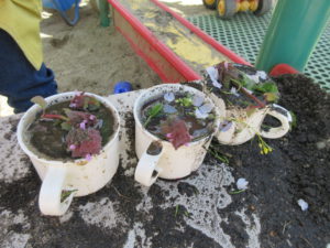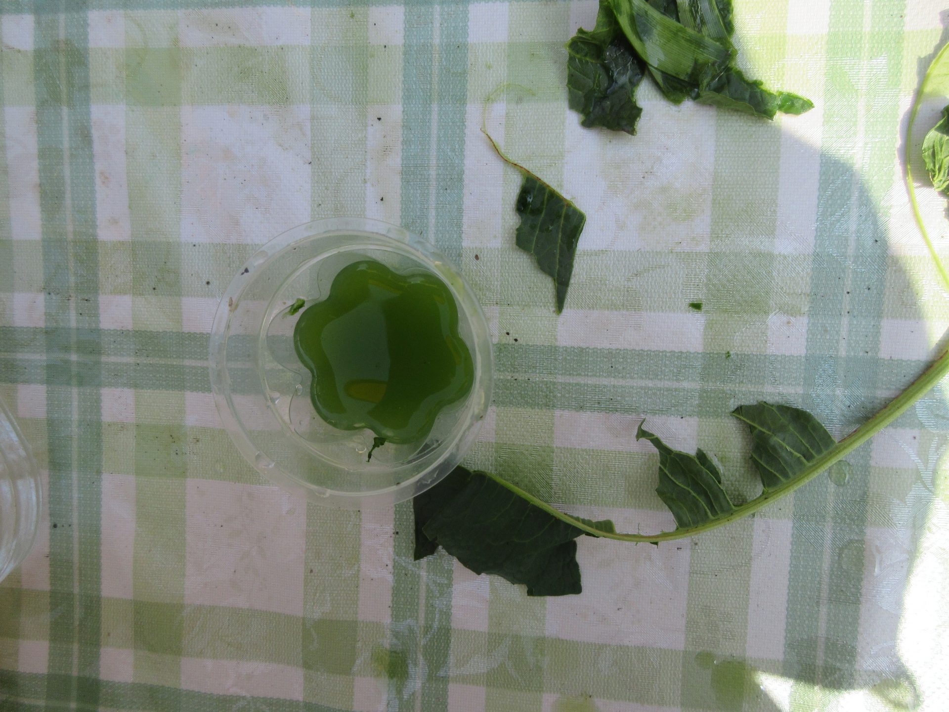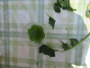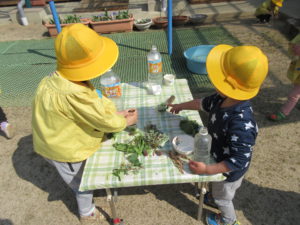ギシギシ・よもぎの葉で、緑色の色水ができ「お茶みたい」「青汁みたいだね」と話していました。