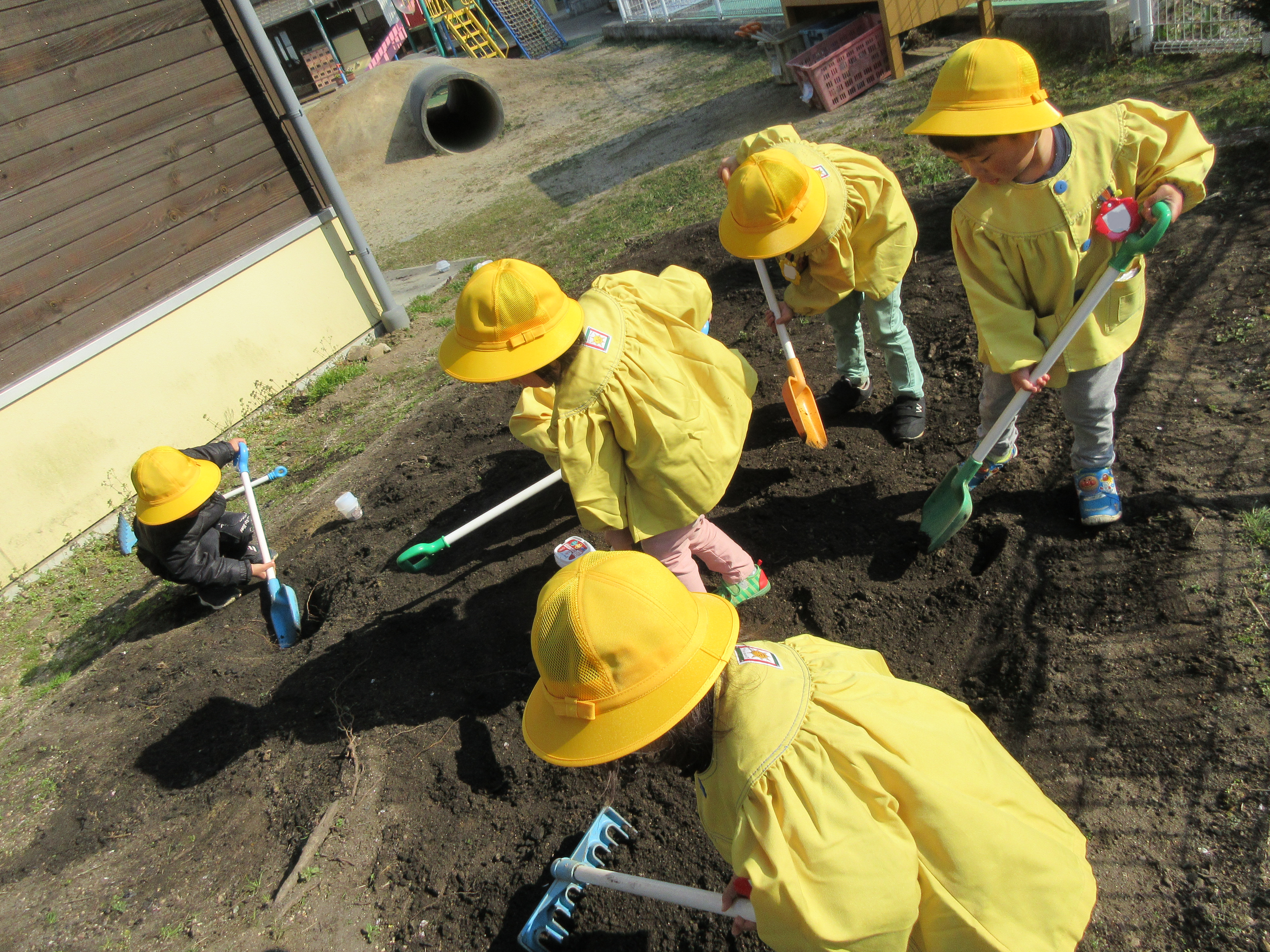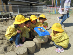 園庭にある畑の土を掘り返して、「何か出てくるかな?」と探す子ども達。