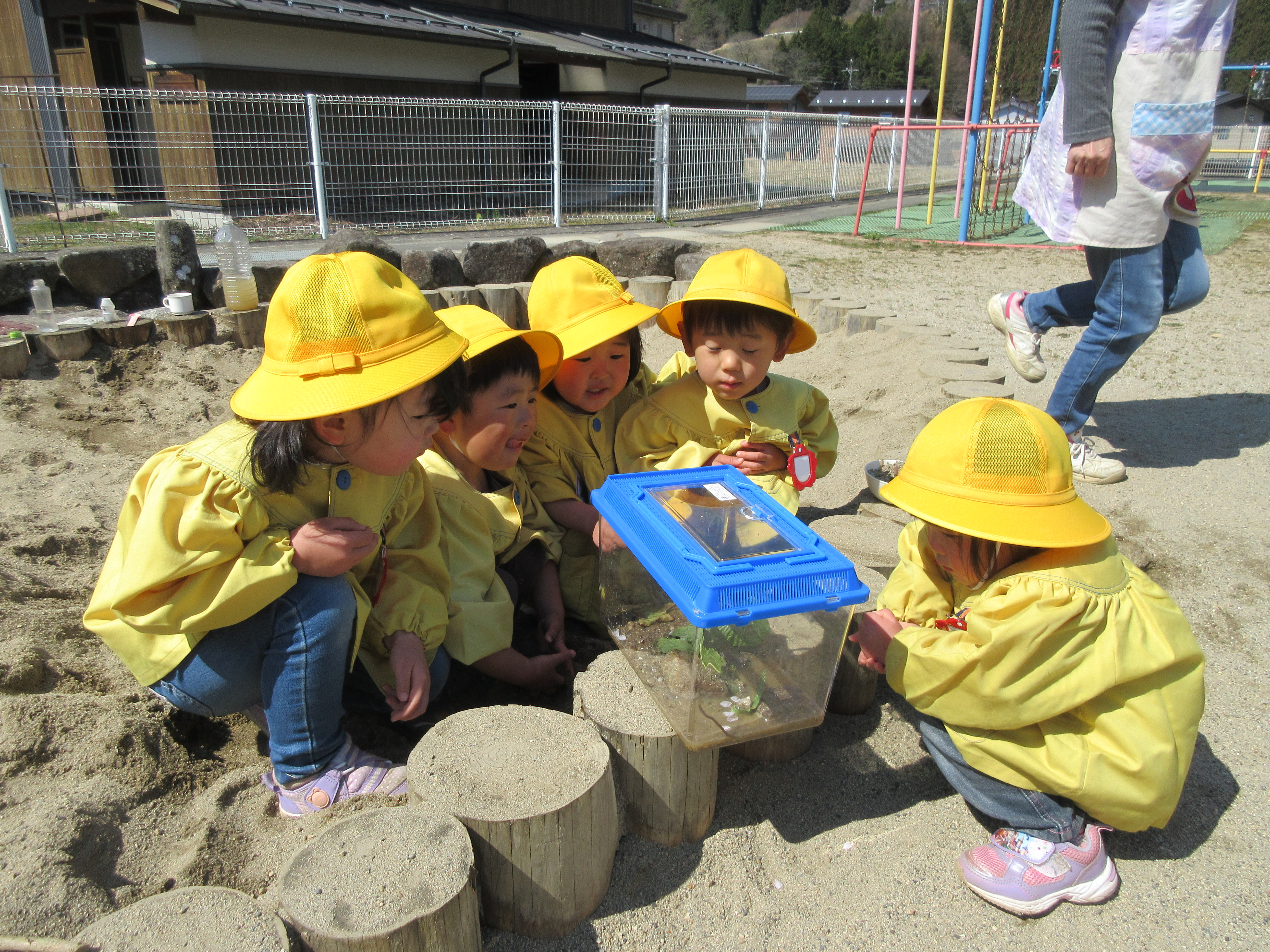 触るのはまだ怖いようなので、飼育ケースに入れてあげると、みんなで集まって観察。
