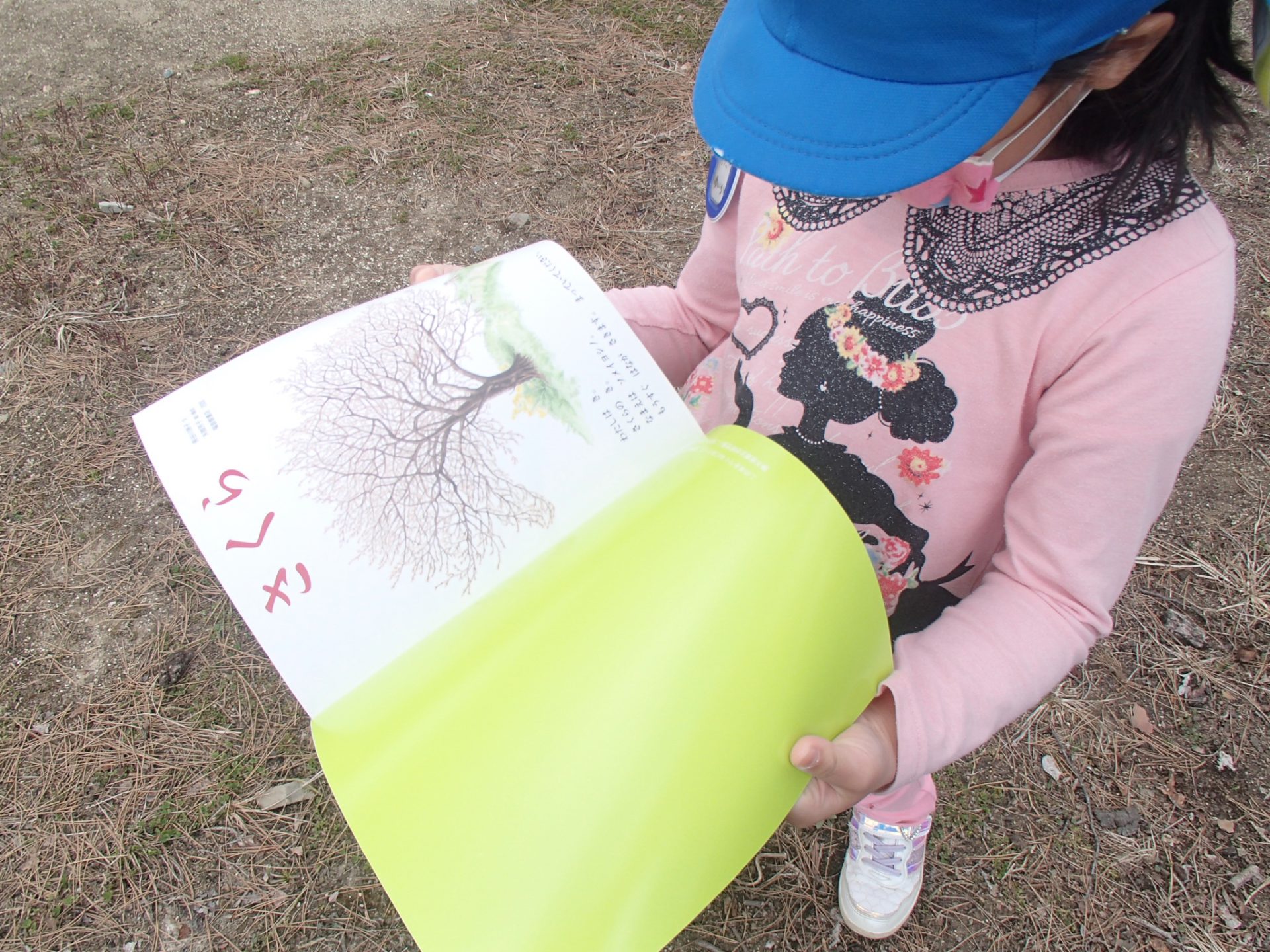 隣のグラウンドに散歩に出掛けました。その日は朝から雪が舞いました。もう4月なのに~驚きました!!昨日読んだ絵本を片手に、花見を楽しみました。