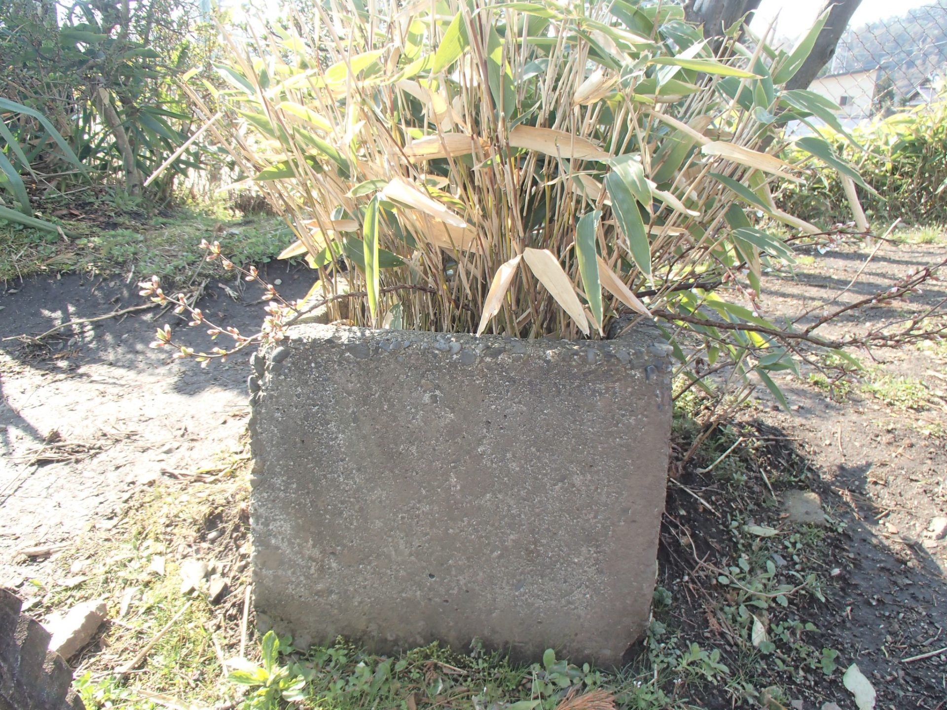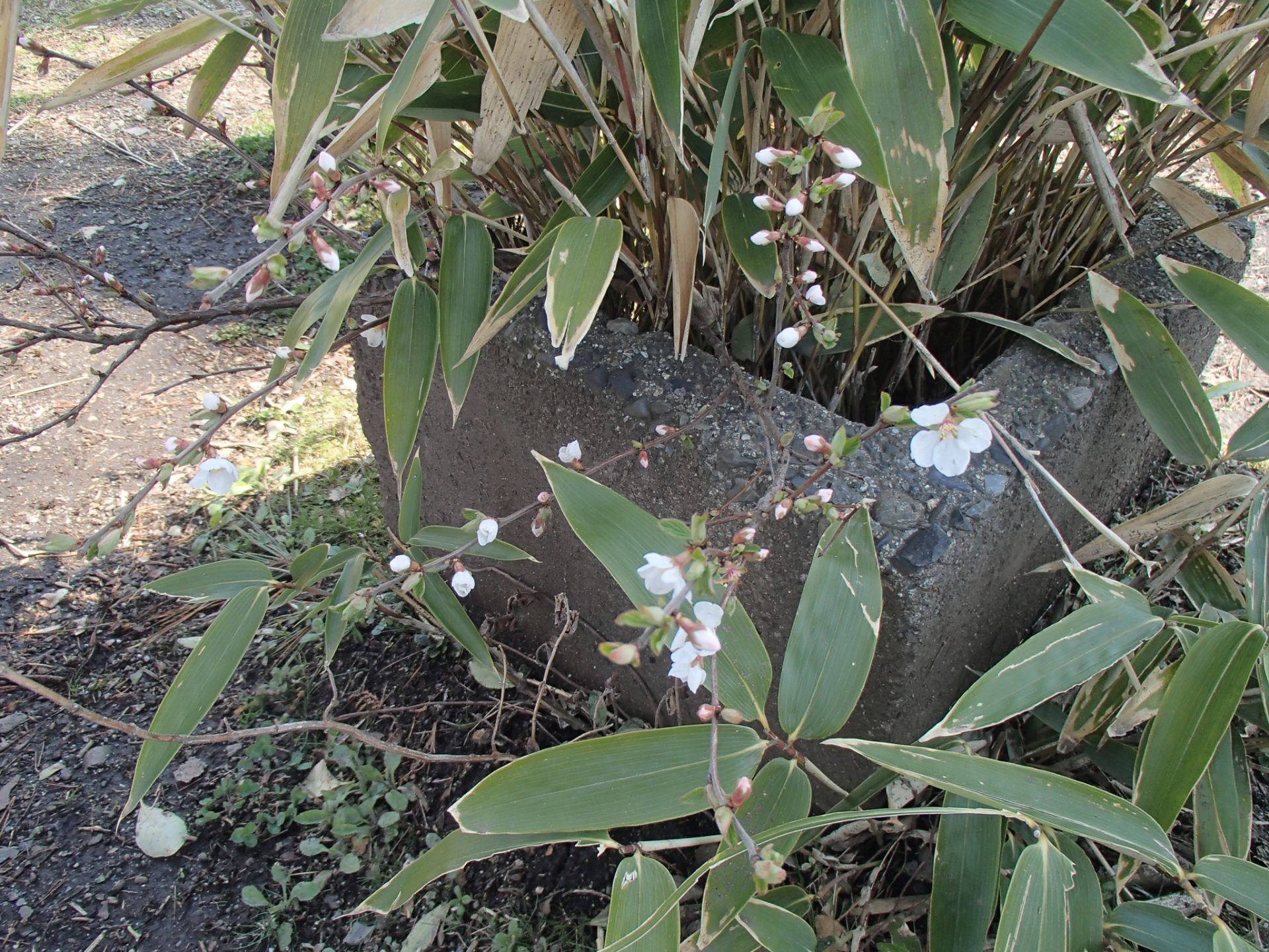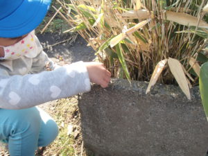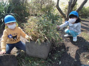 朝、元気に登園した子ども達は早速、外で遊び始めました。小さな花だんにたくさんの笹が生えていて、なんとそこから小さな桜が出てきていました。