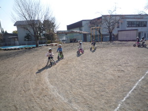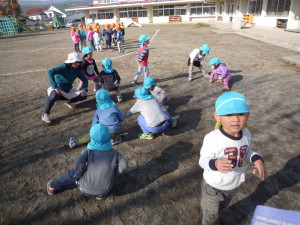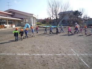 毎日の戸外遊びの中に体力作りを取り入れマラソン始めたのですが子ども達から準備体操をしたり、歩いている友達に声を掛けたりと様々な姿が見られます。外気にたくさん触れ五感を刺激しながら年齢や子どもの状態に合わせて様々な経験や体験が出来るように戸外遊びを大事にしていきたいと思います。