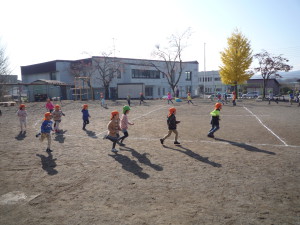 外に出ると自分達で準備体操を始め、音楽が始まると元気にマラソンのスタートです。