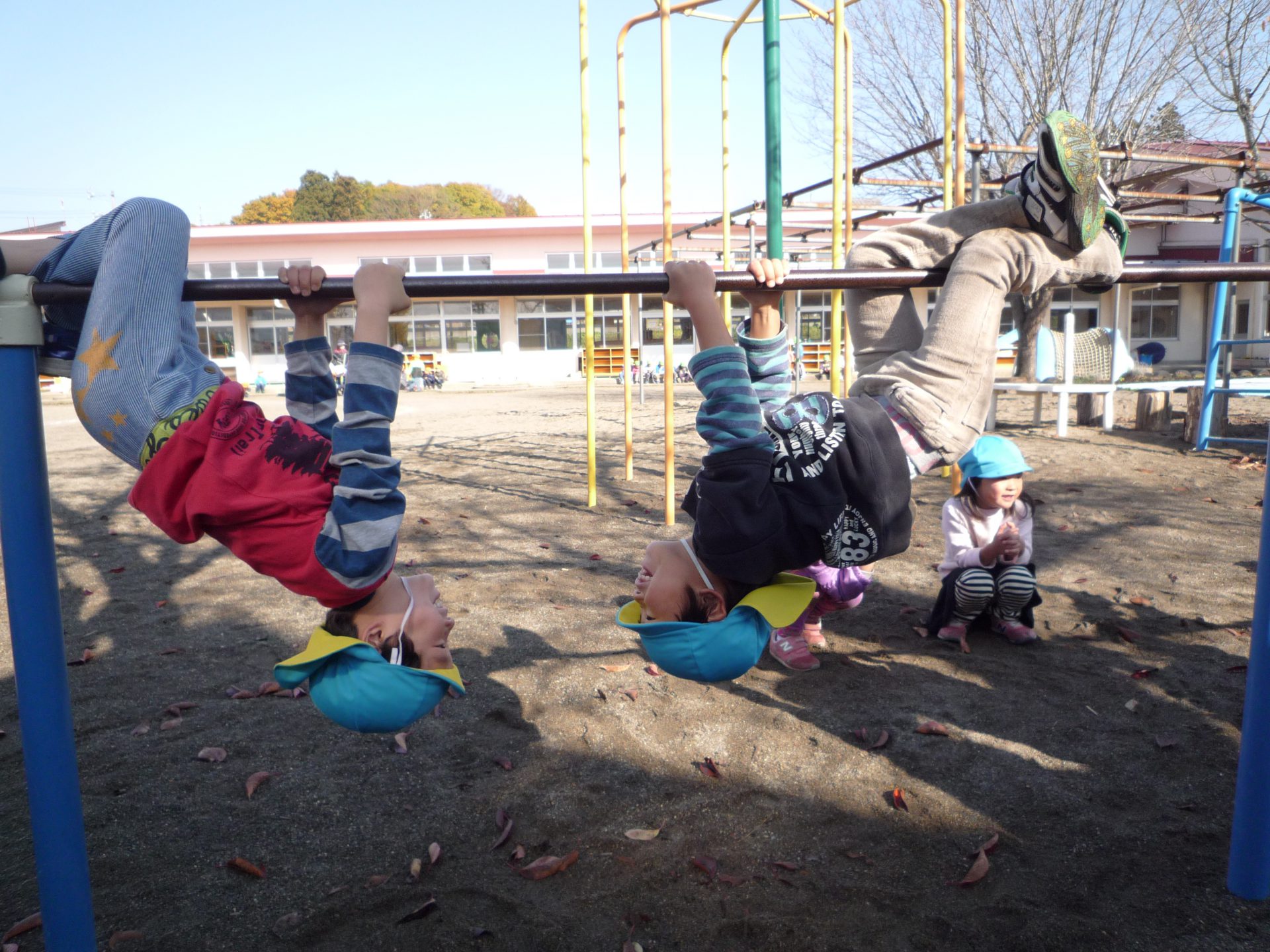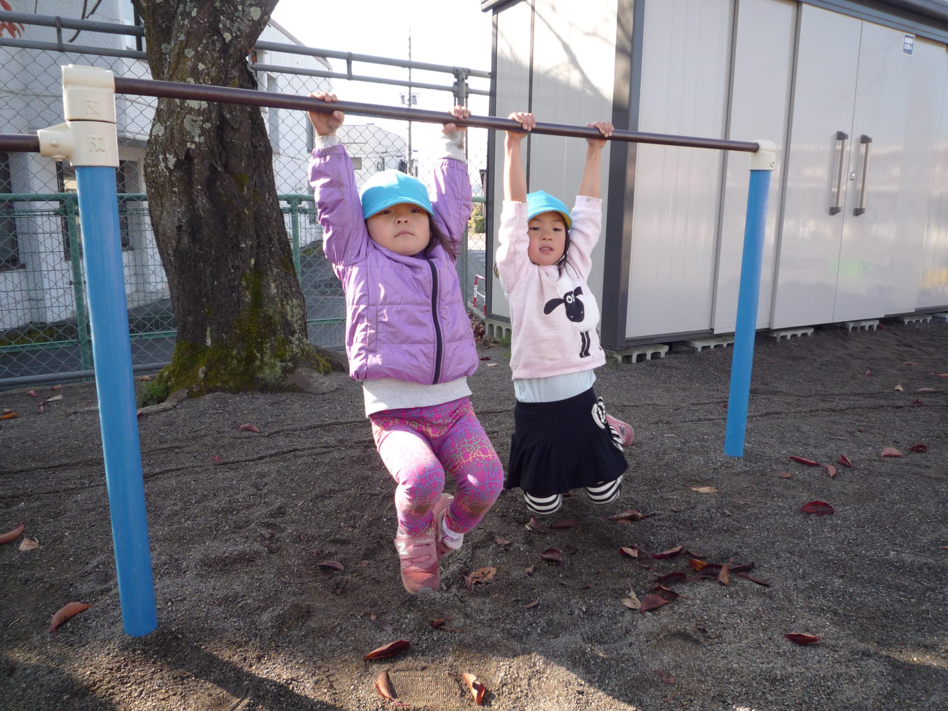 3歳児は鉄棒に取り組んでいて「ぶら下がり」や「豚の丸焼き」も出来るようになりました。