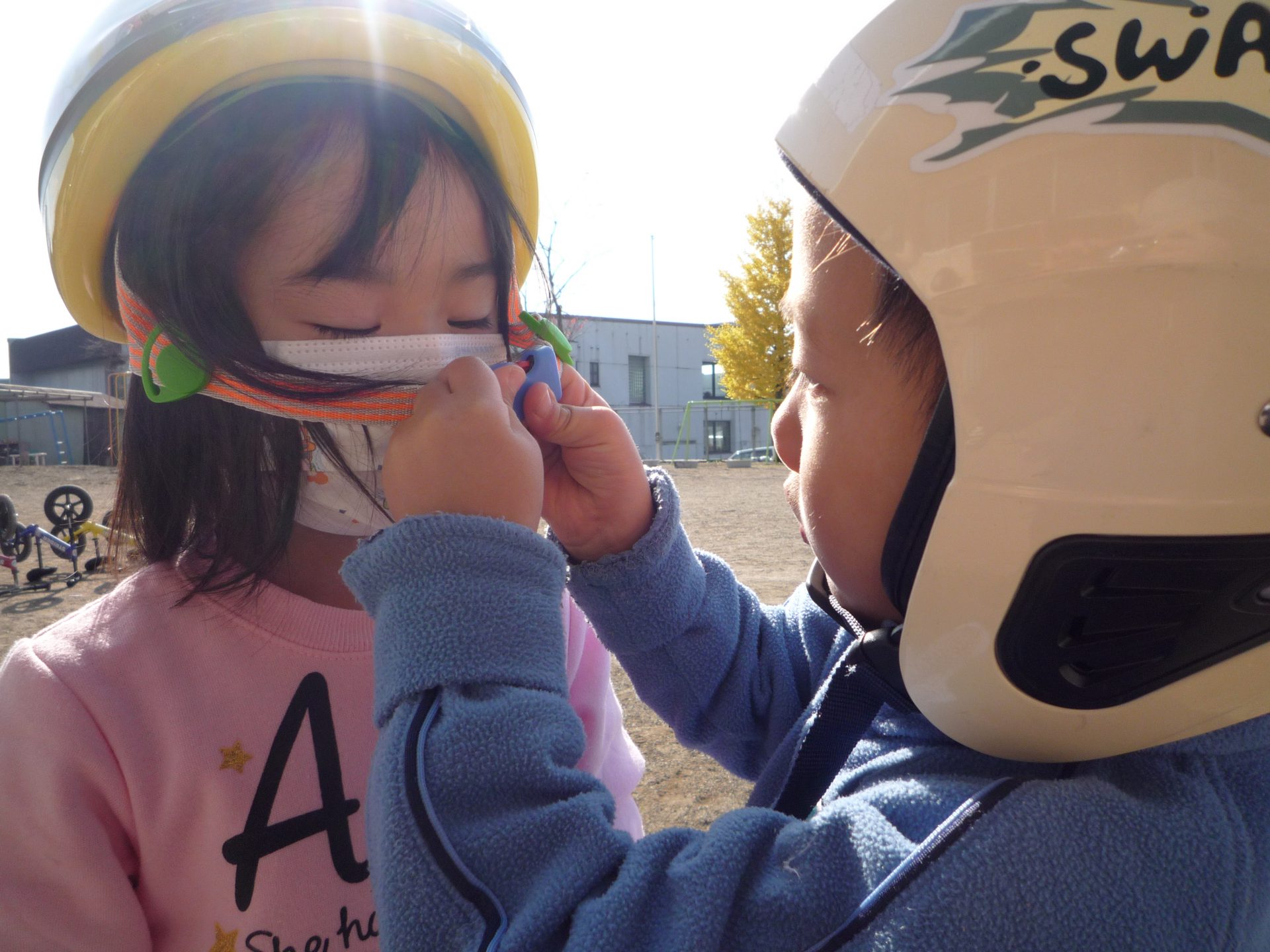 ヘルメットが上手にかぶれない友達にそっと手伝ってくれる優しい姿が良いですね。