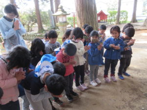 神様の前で手を合わせ、「ぞうさん(年長)になりました。見守ってください。」と一言。
