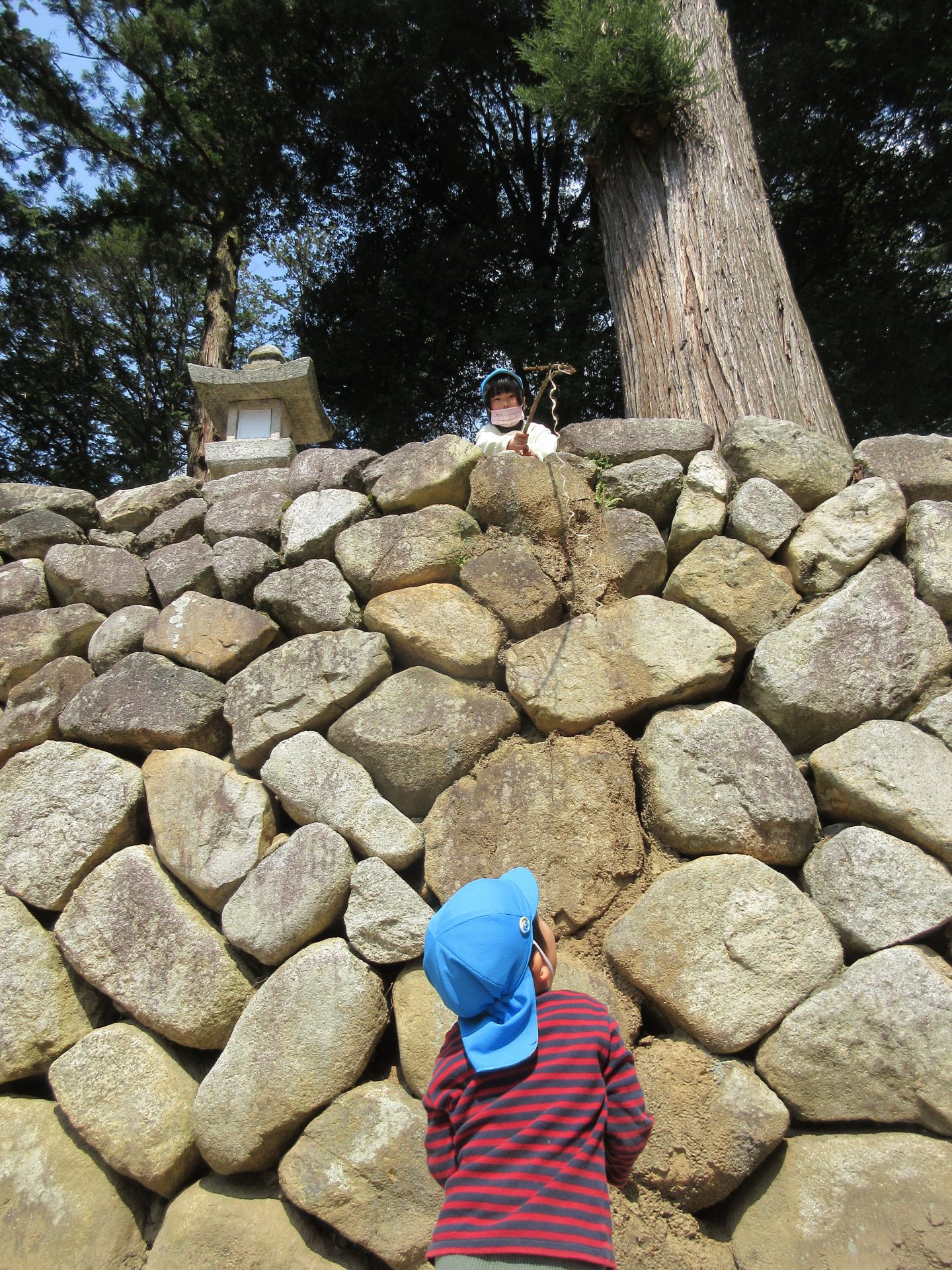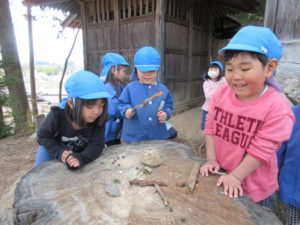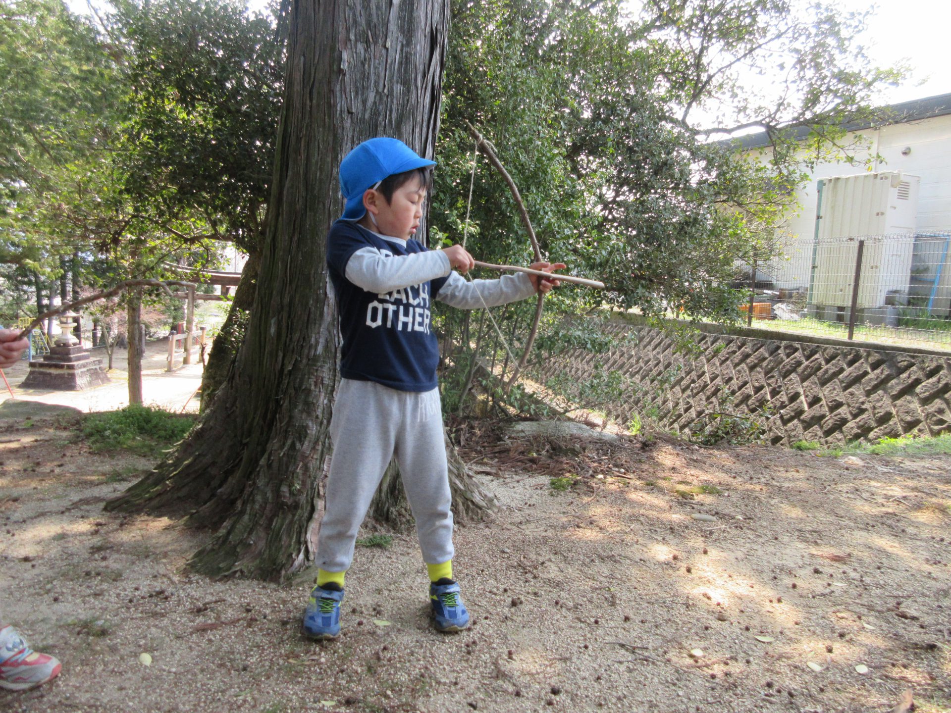 神社では昨年から引き継がれた弓矢やバーべキュウ、釣りなど好きな遊びを見つけ、自然の中にある物を