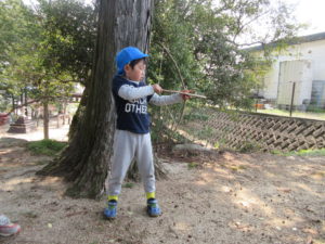 紐をつけて作った弓矢も上手に持って飛ばせるようになりました。