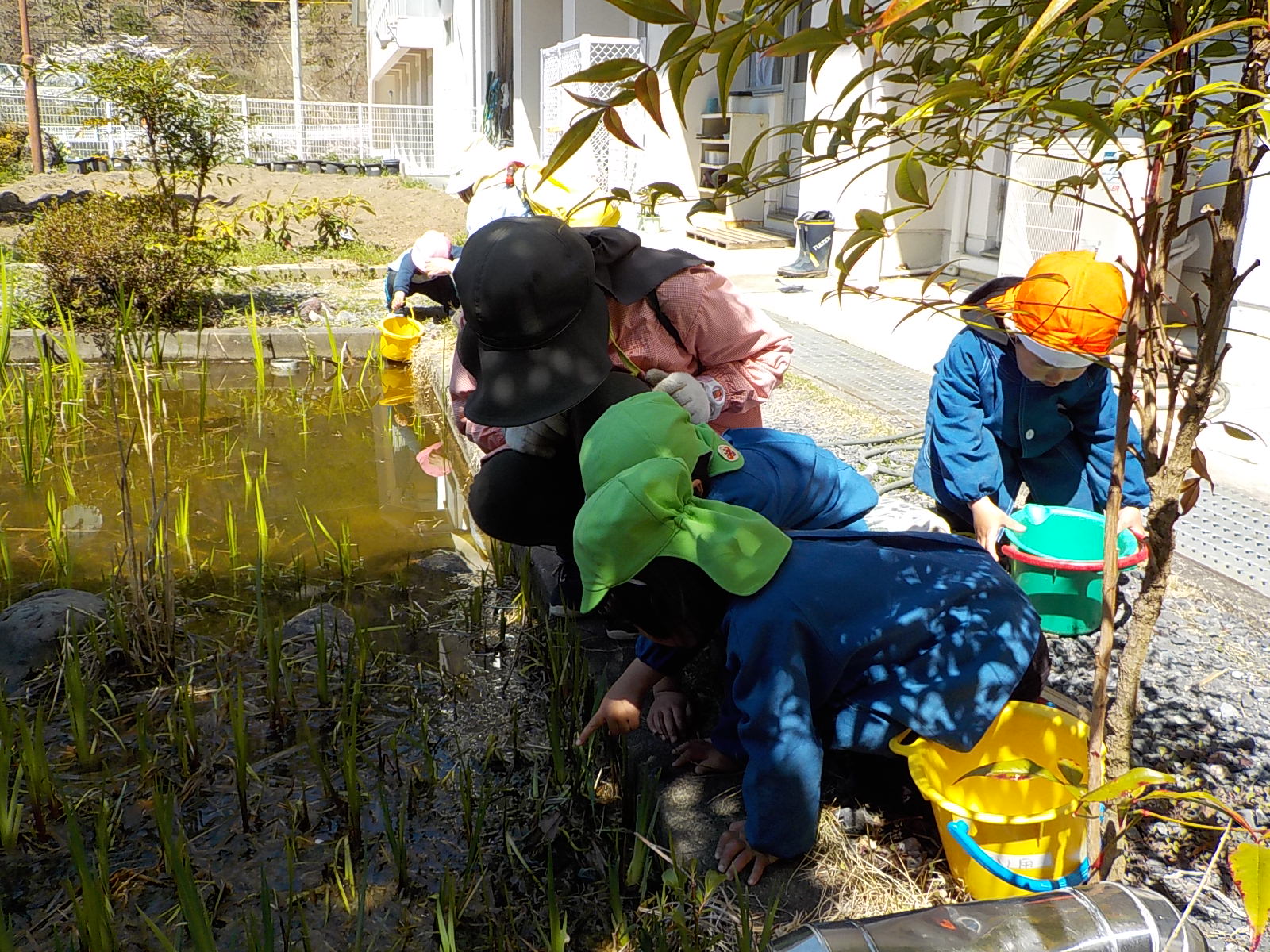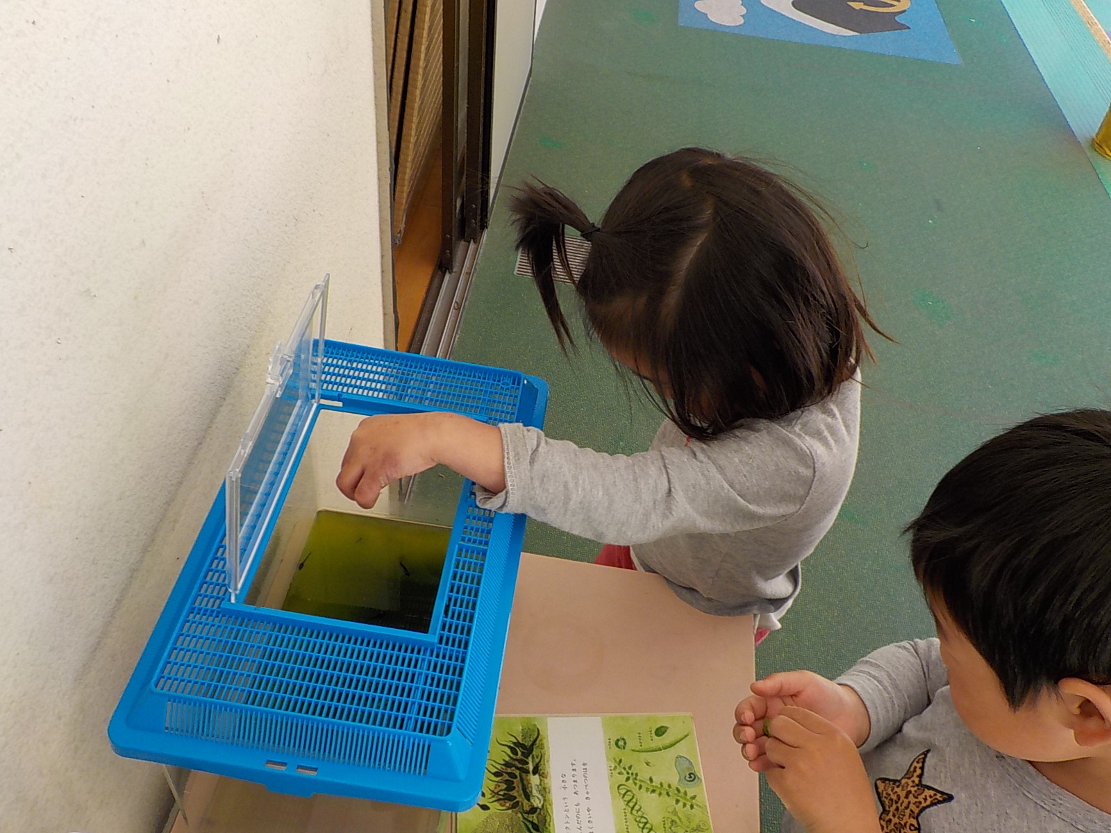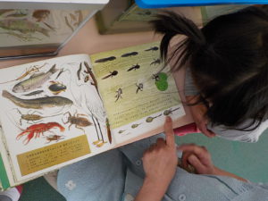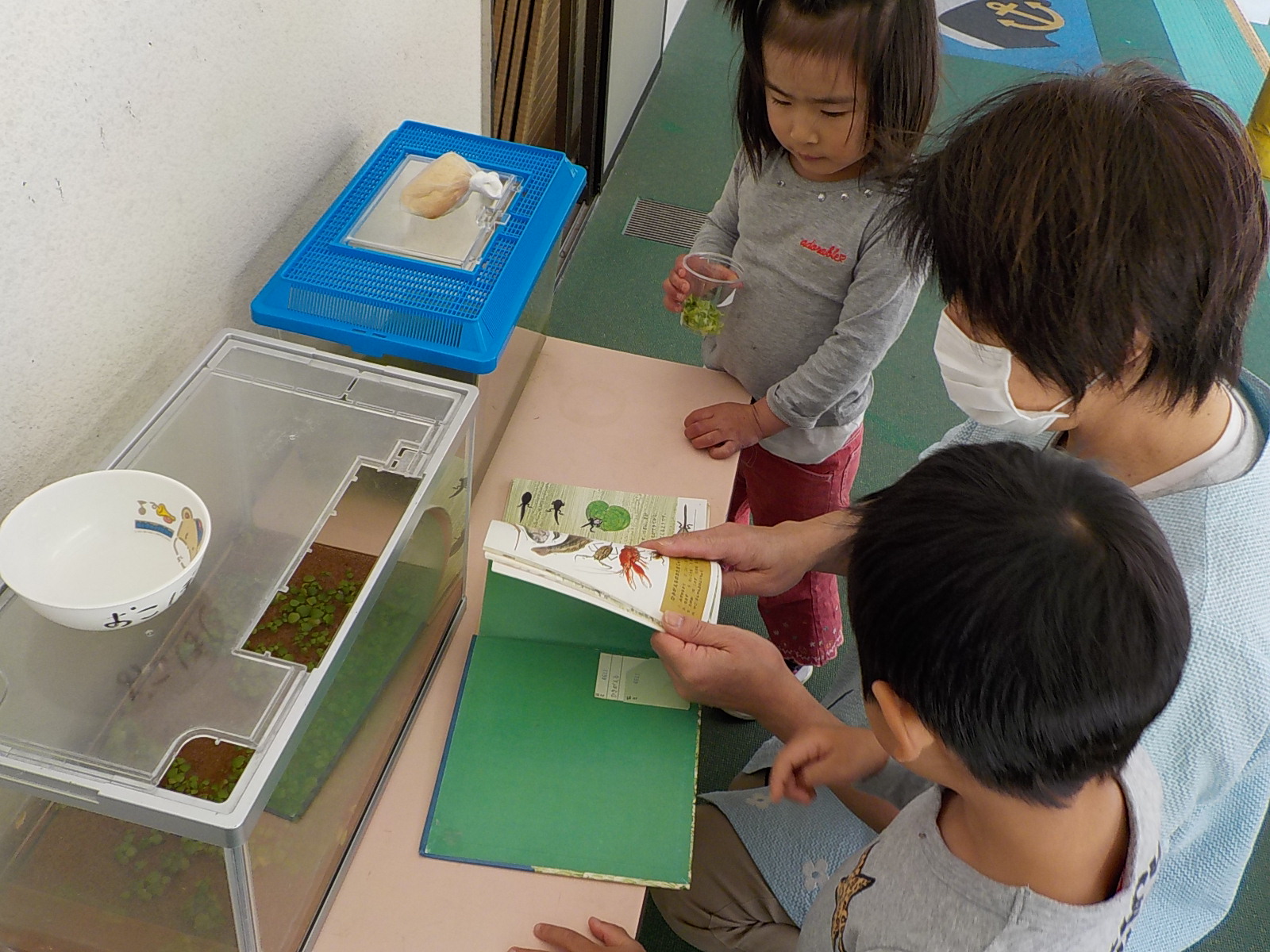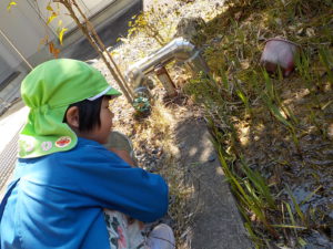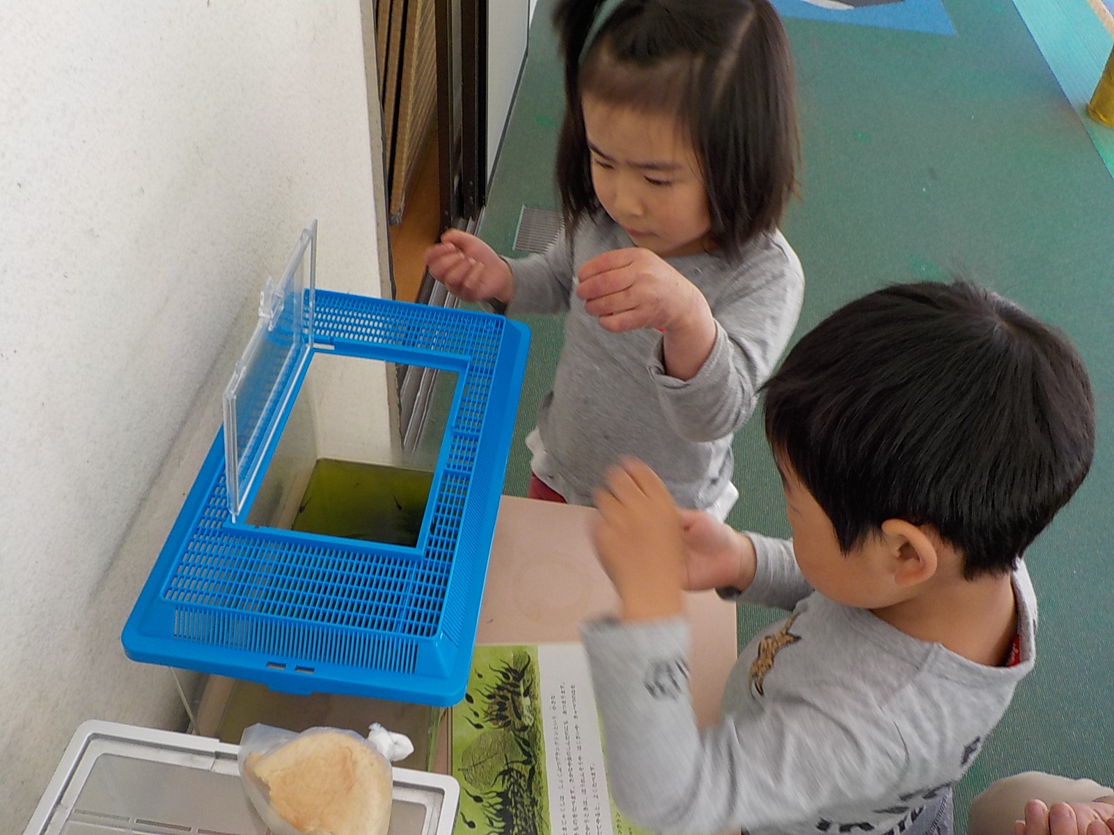オタマジャクシにもご飯をあげないと、ということでみんなでご飯をあげることにしました。
